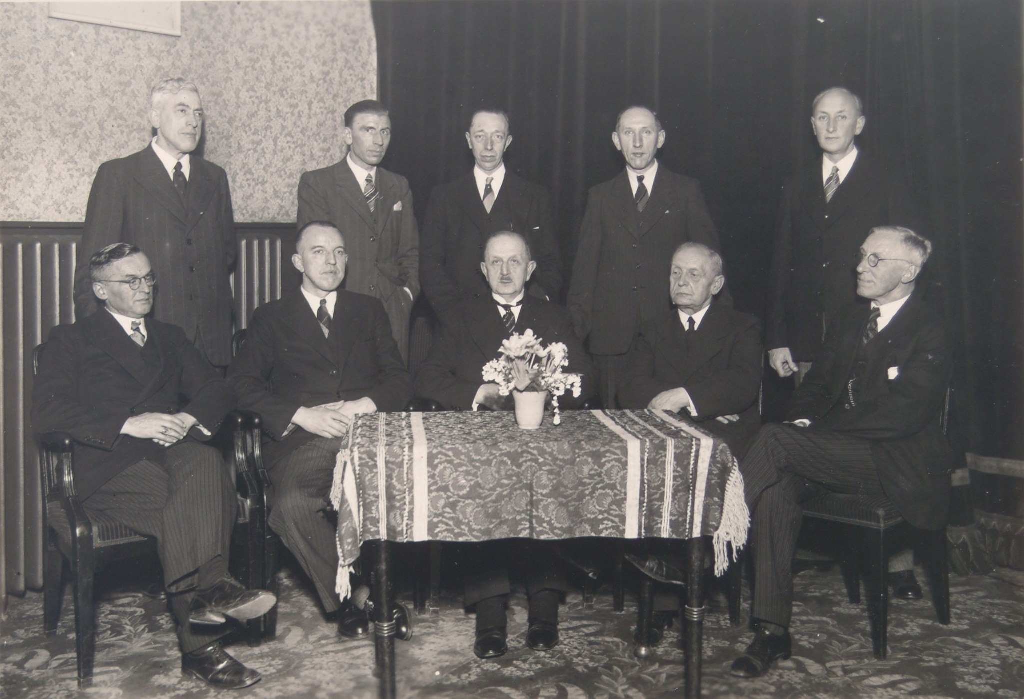 Afscheid wegens emeritaat van predikant S. van der Woude van de Evangelisch-Lutherse gemeente te Dordrecht. Hij wordt omgeven door het kerkbestuur