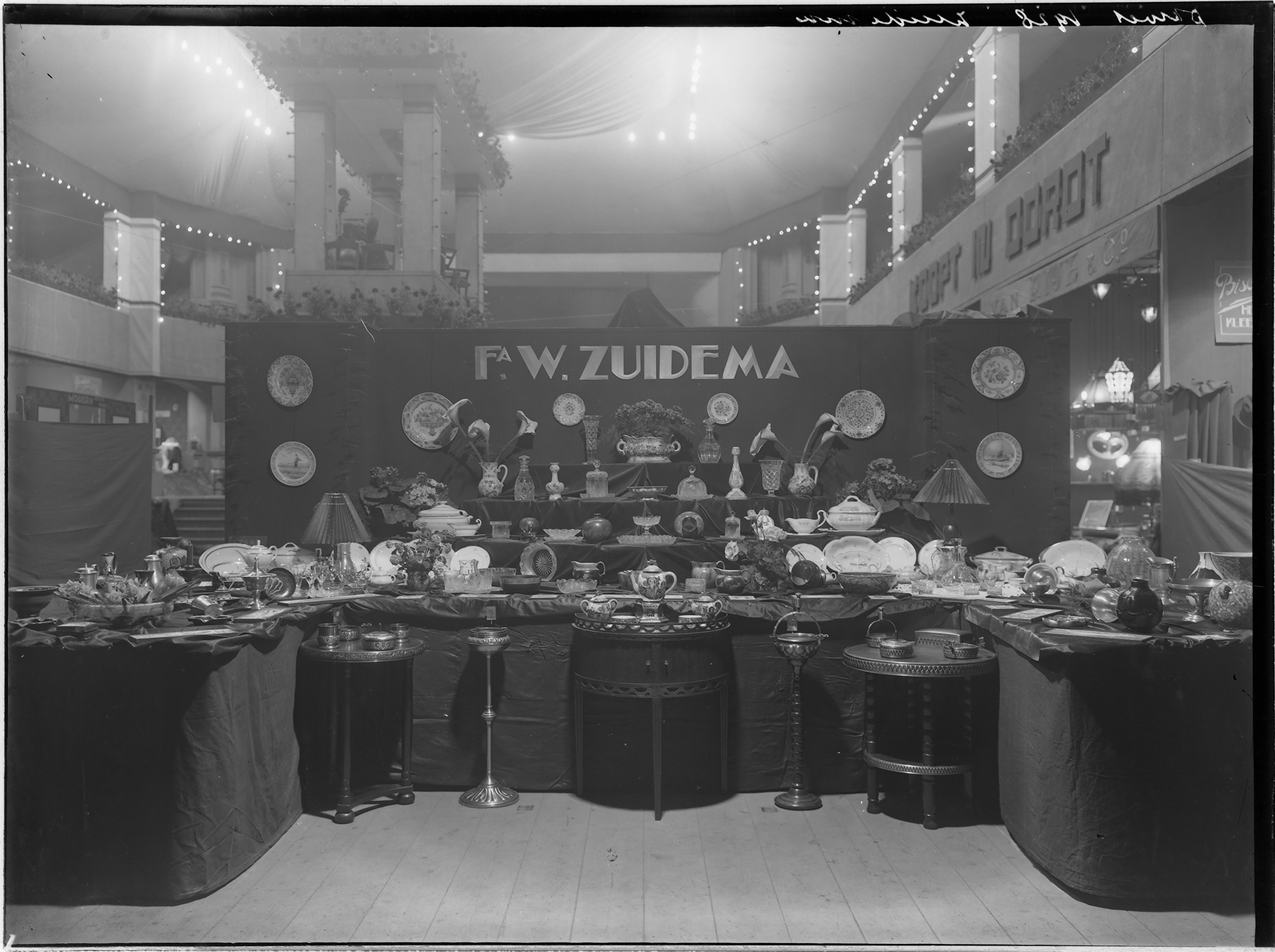 Stand met aardewerk en porselein van de fa. W. Zuidema op de Dawet in Kunstmin