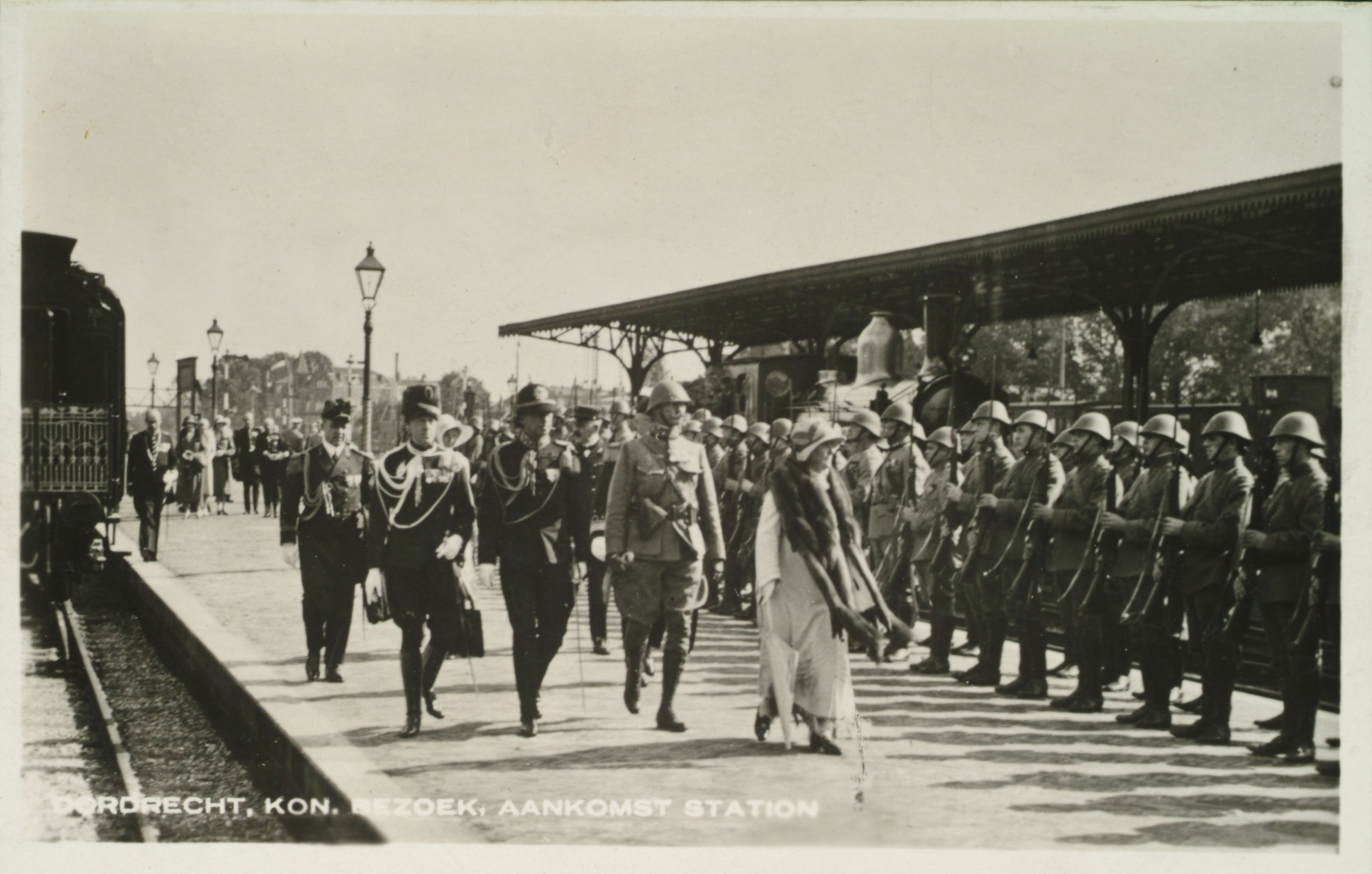 - Aankomst op het station van koningin Wilhelmina t.g.v. de opening van de Zeehaven. De erehaag werd gevormd door het korps Pontonniers en Torpedisten.