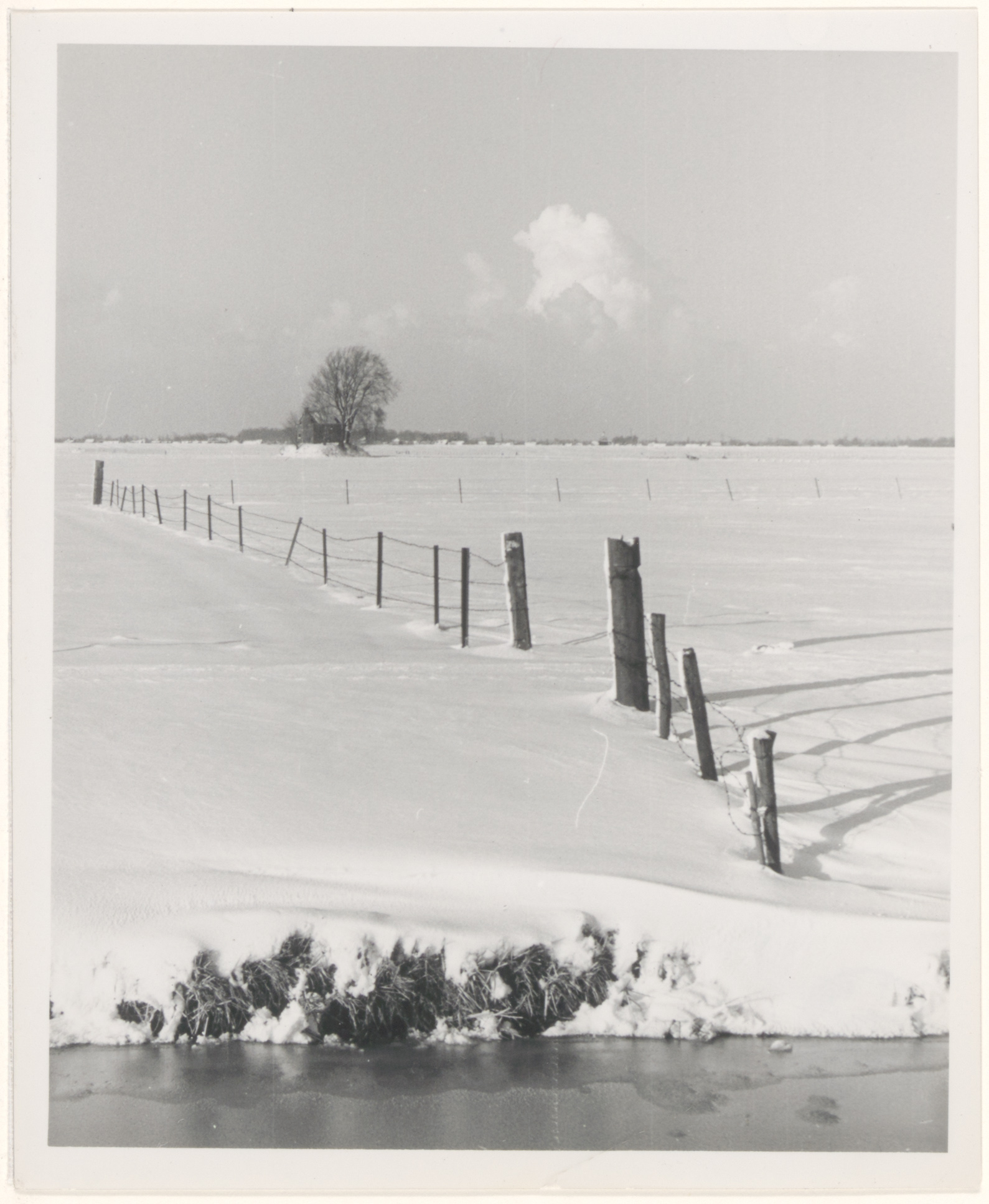 Een niet nader gelokaliseerd winterlandschap te Zwijndrecht of 's-Gravendeel: bevroren sloot, besneeuwde akker, terp met huis en boom, lucht met cumulus.