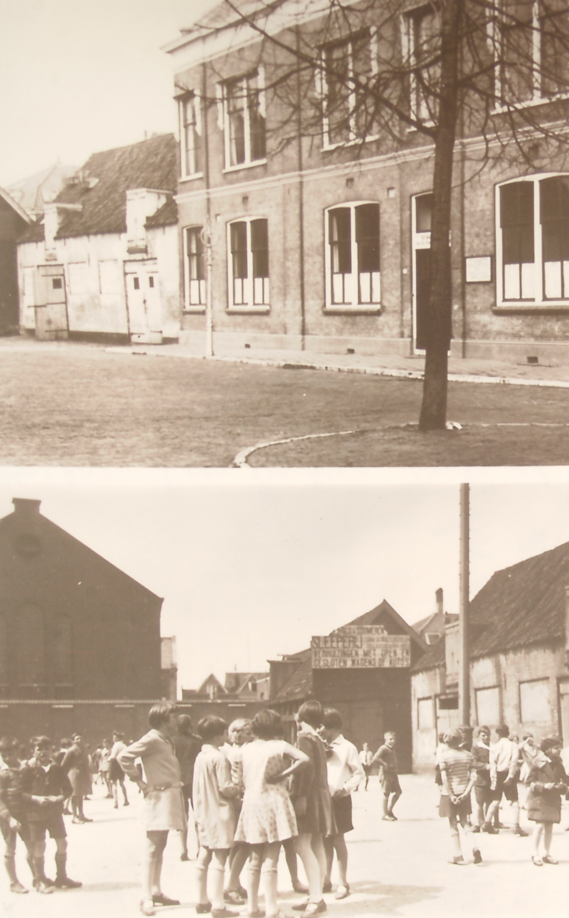 Twee foto's van het Stek: boven bijzondere lagere en ulo school Stek en onder schoolkinderen met op de achtergrond het huis van bewaring aan de Doelstraat ca 1938