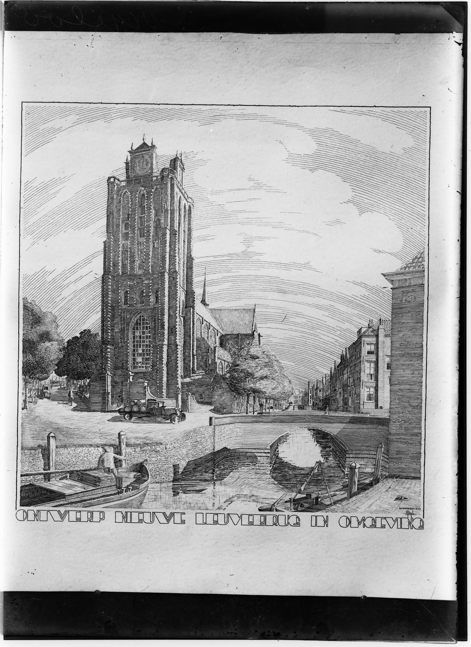 - Tekening ontwerp nieuwe Leuvebrug. Grote Kerk met de Voorstraatshaven en Pottenkade