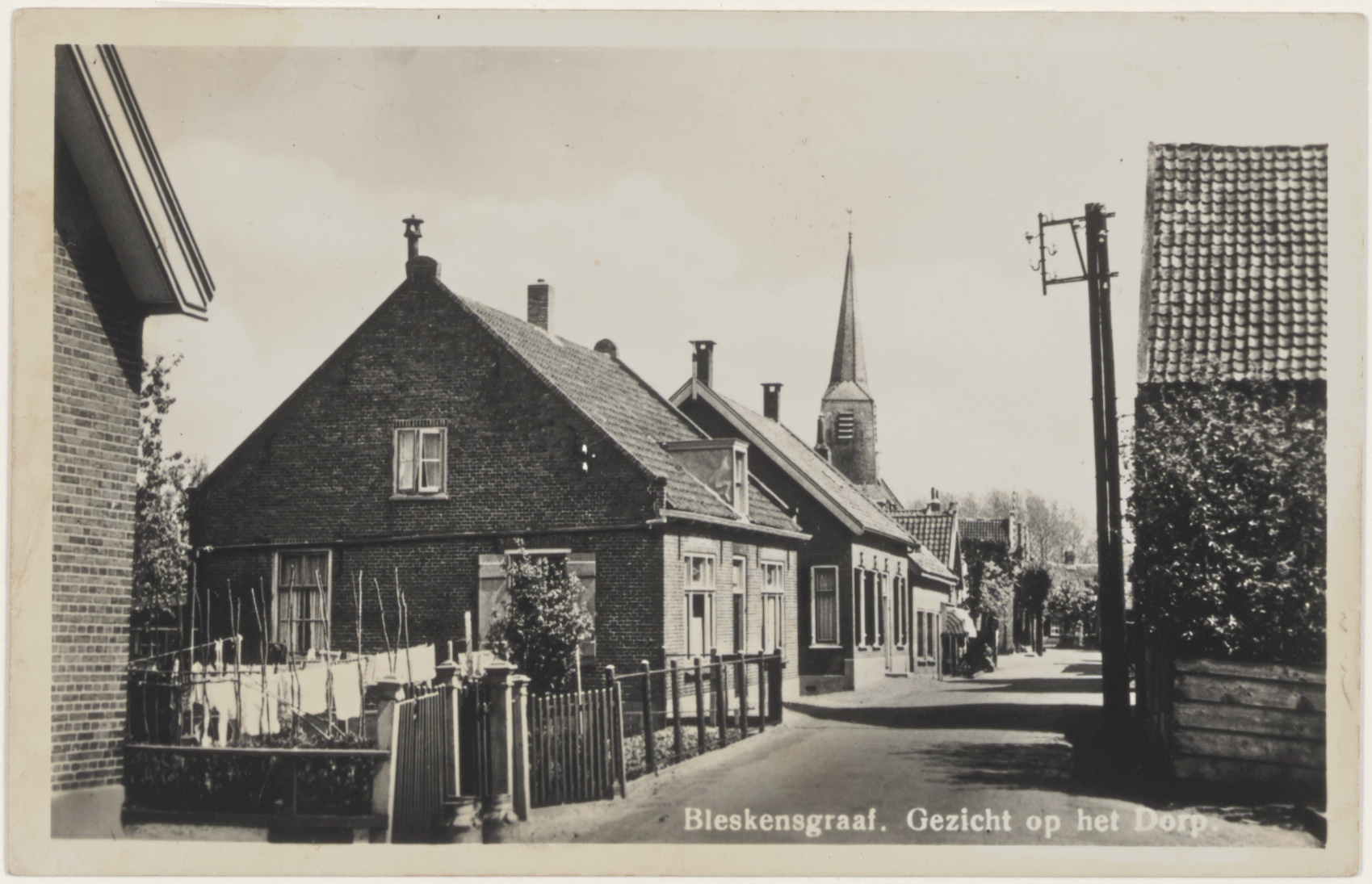 Kerkstraat Bleskensgraaf met hier nog de oude Kerk op de achtergrond. (Foto vóór 1940.)