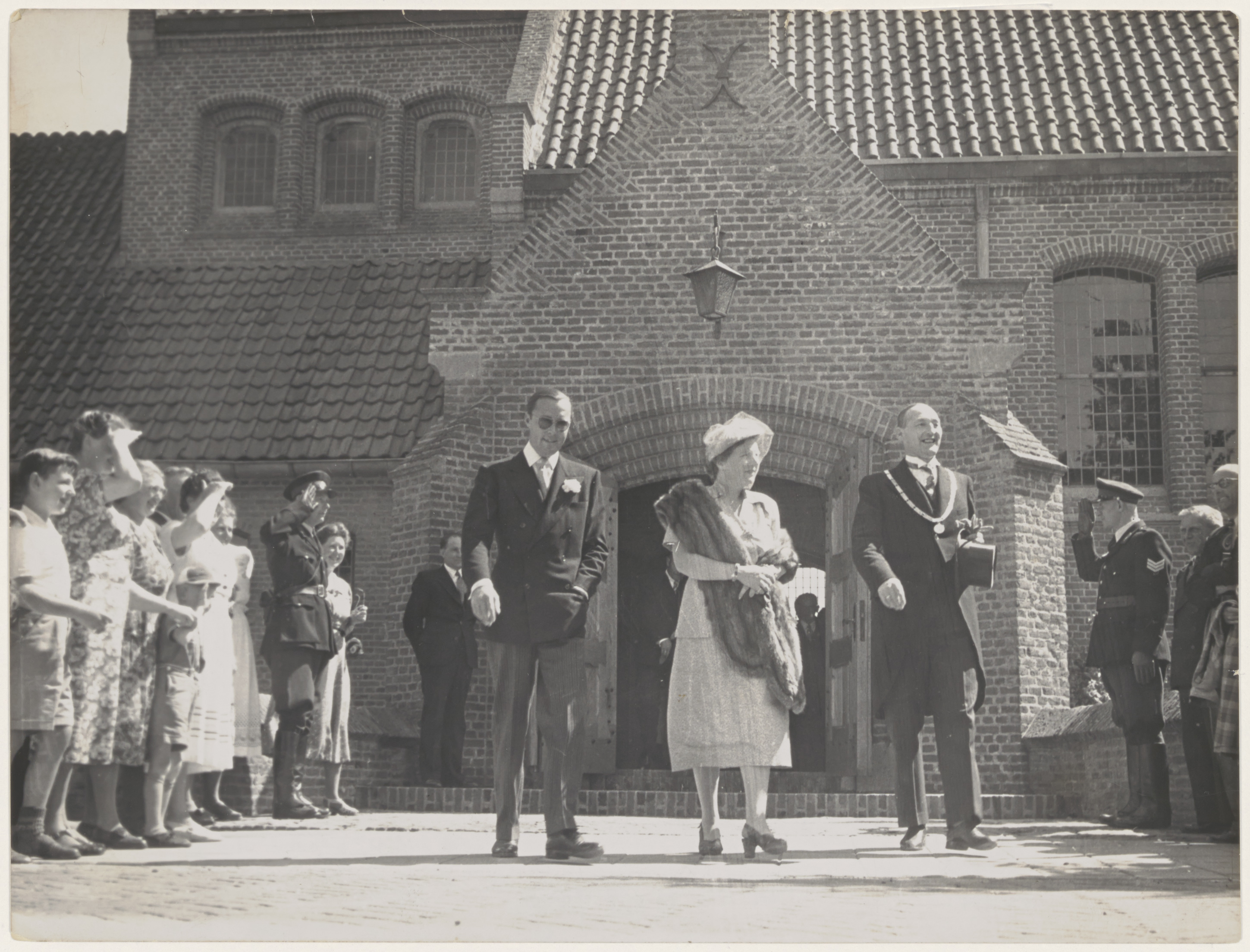 Bezoek Koningin Juliana en Prins Bernard aan Bleskensgraaf 28 juli 1951. Hier met burgemeester C.G.van Dobbe voor de Hervormde Kerk.