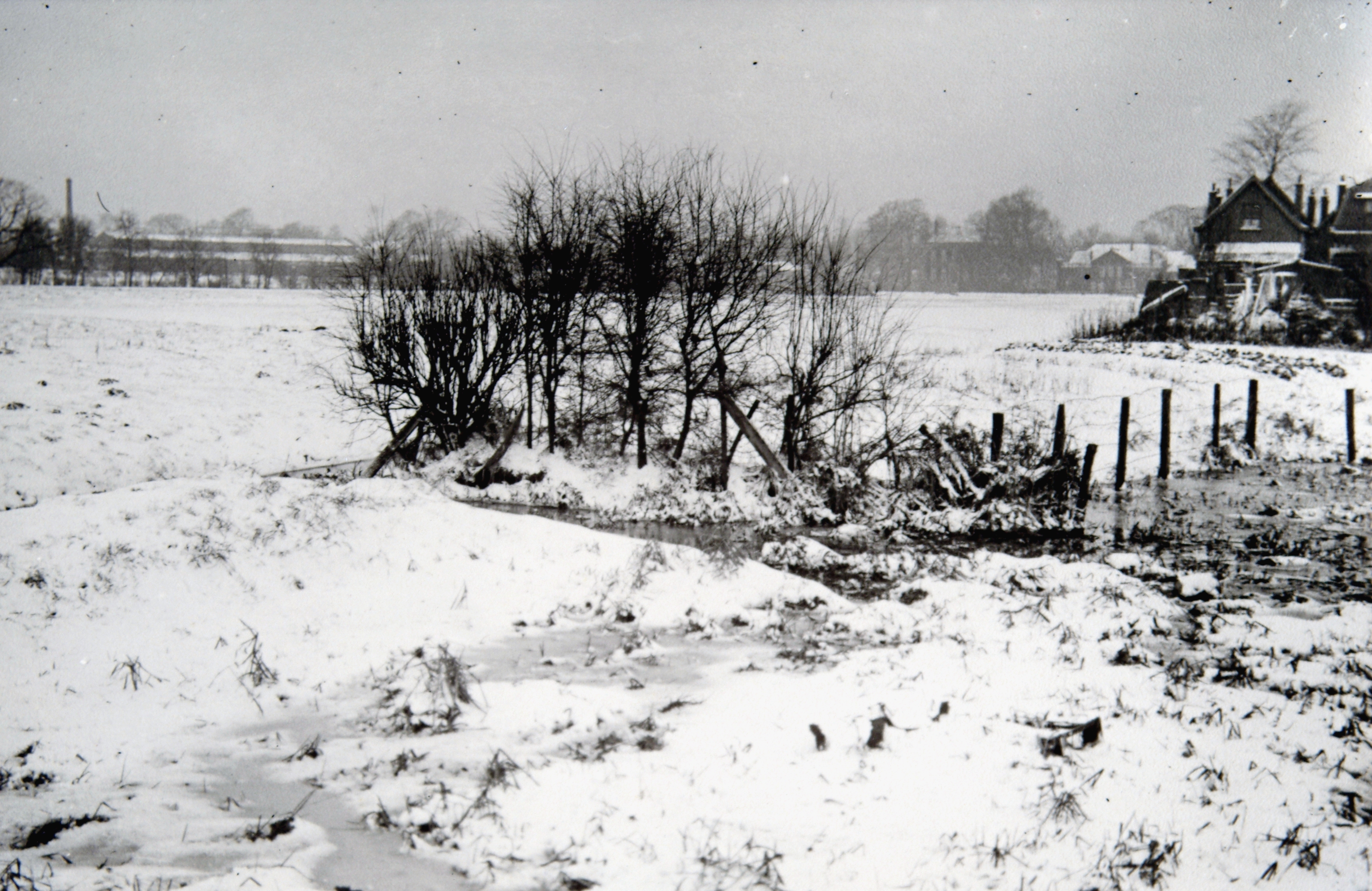 - De zgn. Driehoek - een uitgegraven stuk land aan de Verlengde Catsstraat over de Wei van de Roo. De Hugo de Grootlaan loopt over de wei van links naar rechts. De horizontale streep links op de achtergrond is de fabriek van Lips. Weizigt ligt rechts op de achtergrond. Geheel rechts staan huizen in de Tesselschadestraat die toen nog doodliep.