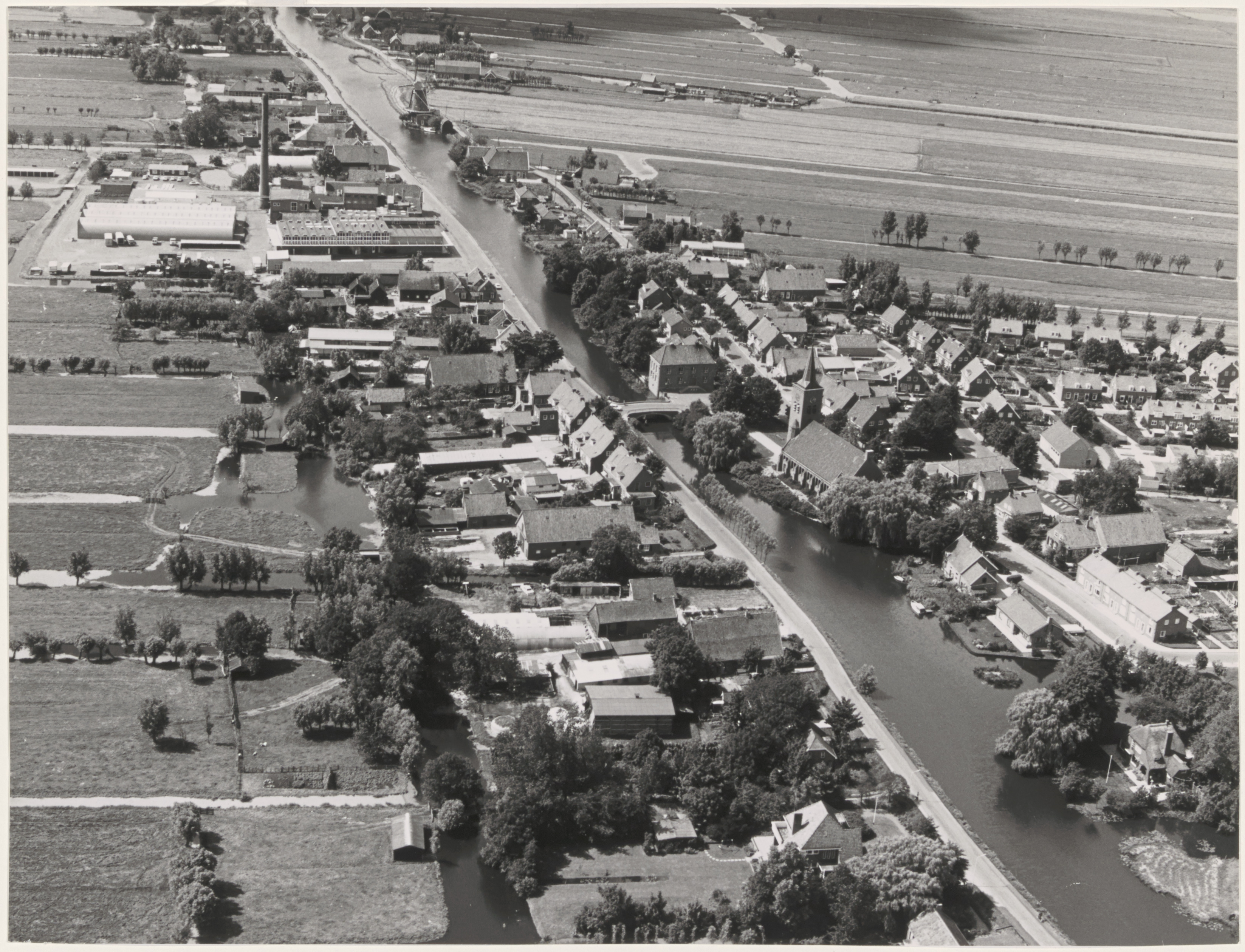Luchtfoto Bleskensgraafmet links boven melkfabriek De Graafstroom. In het midden het gemeentehuis en Hervormde Kerk. Rechts onder naar links boven Hofwegen/Dorpsstraat en rechts van de Graafstroom Meulenbroek/Kerkstraat in Bleskensgraaf.