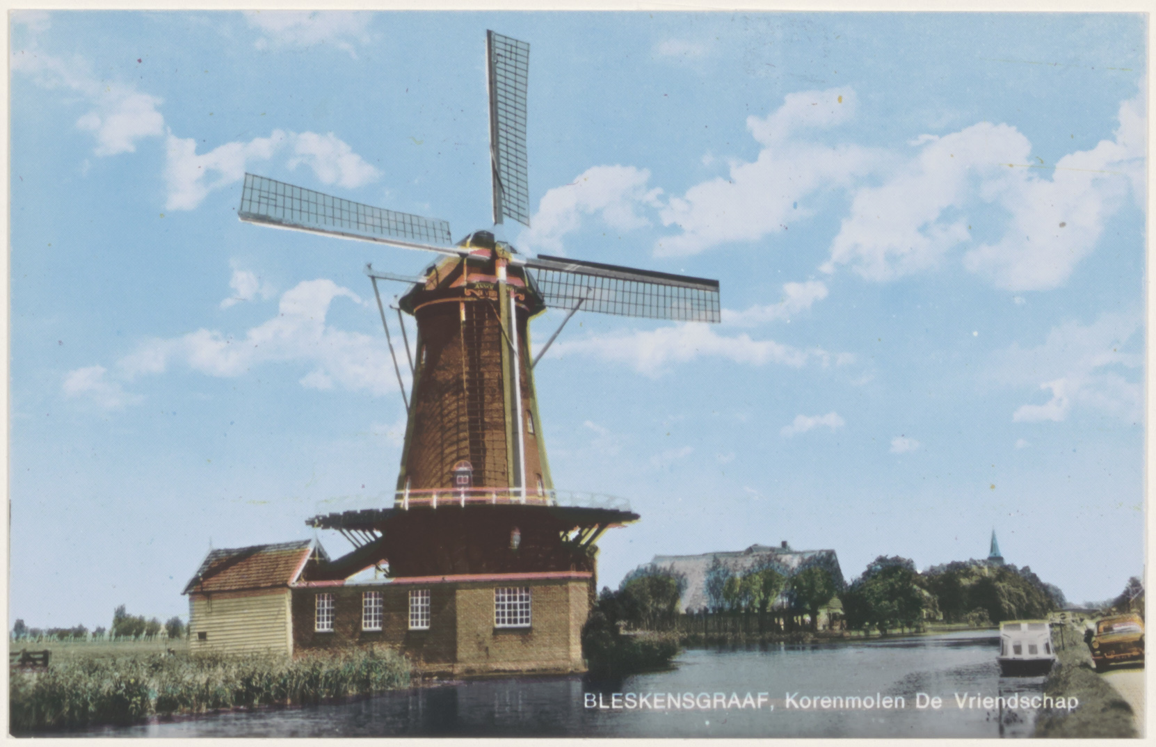 Vanaf Abbekesdoel zicht op molen de Vriendschap aan de Heulenslag 3 in Bleskensgraaf.