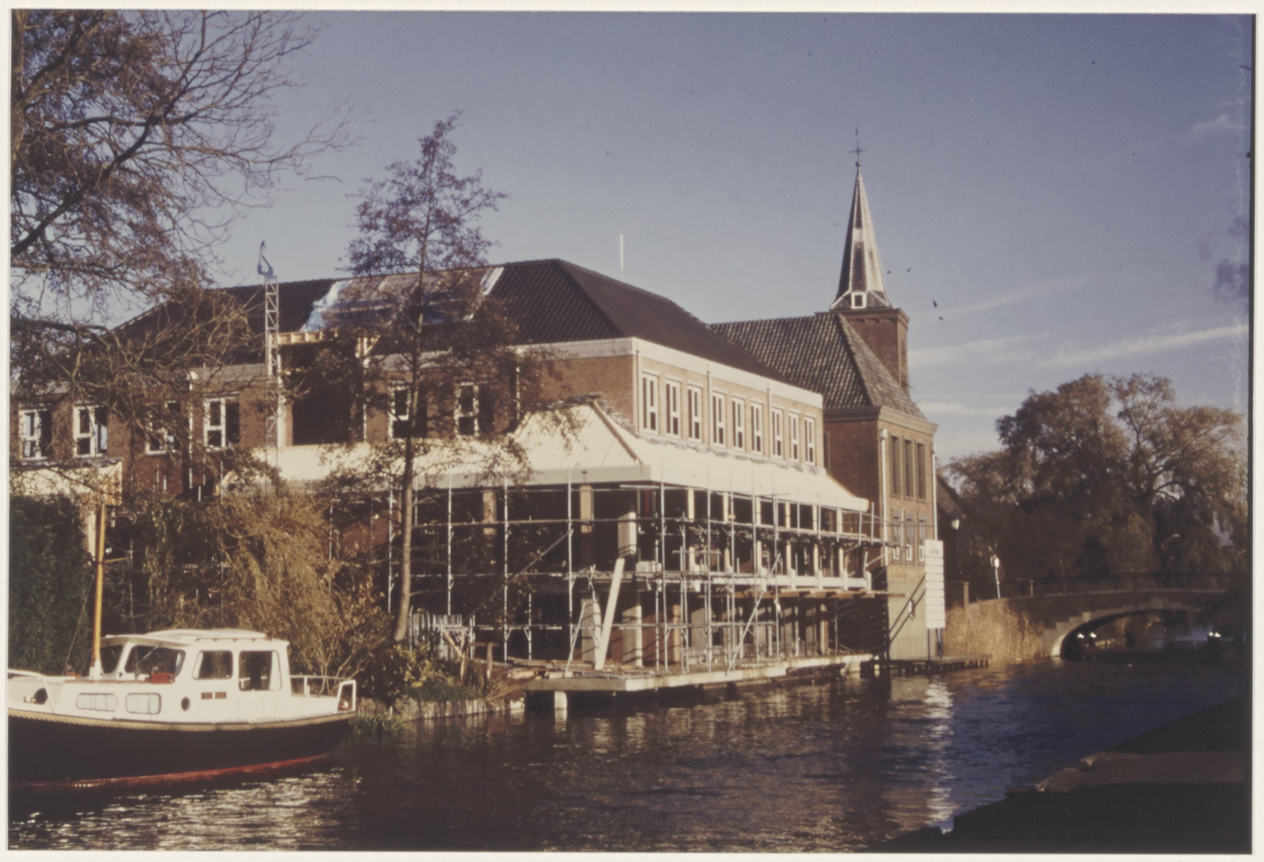 Nieuwbouw gemeentehuis aan de Kerkstraat gezien vanaf de Dorpsstraat in BLeskensgraaf. (1955?)