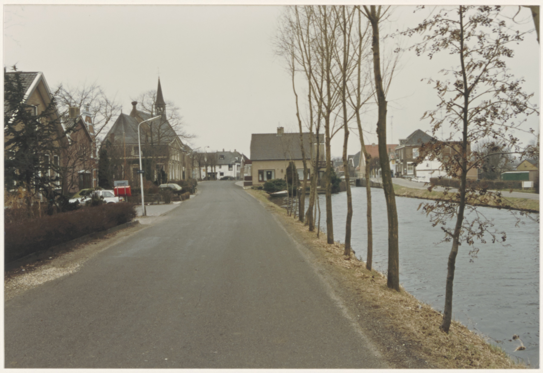 Dorpsstraat thv de Steeg met op de achtergrond de Hervormde Kerk van Molenaarsgraaf, en rechts de Graafstroom.