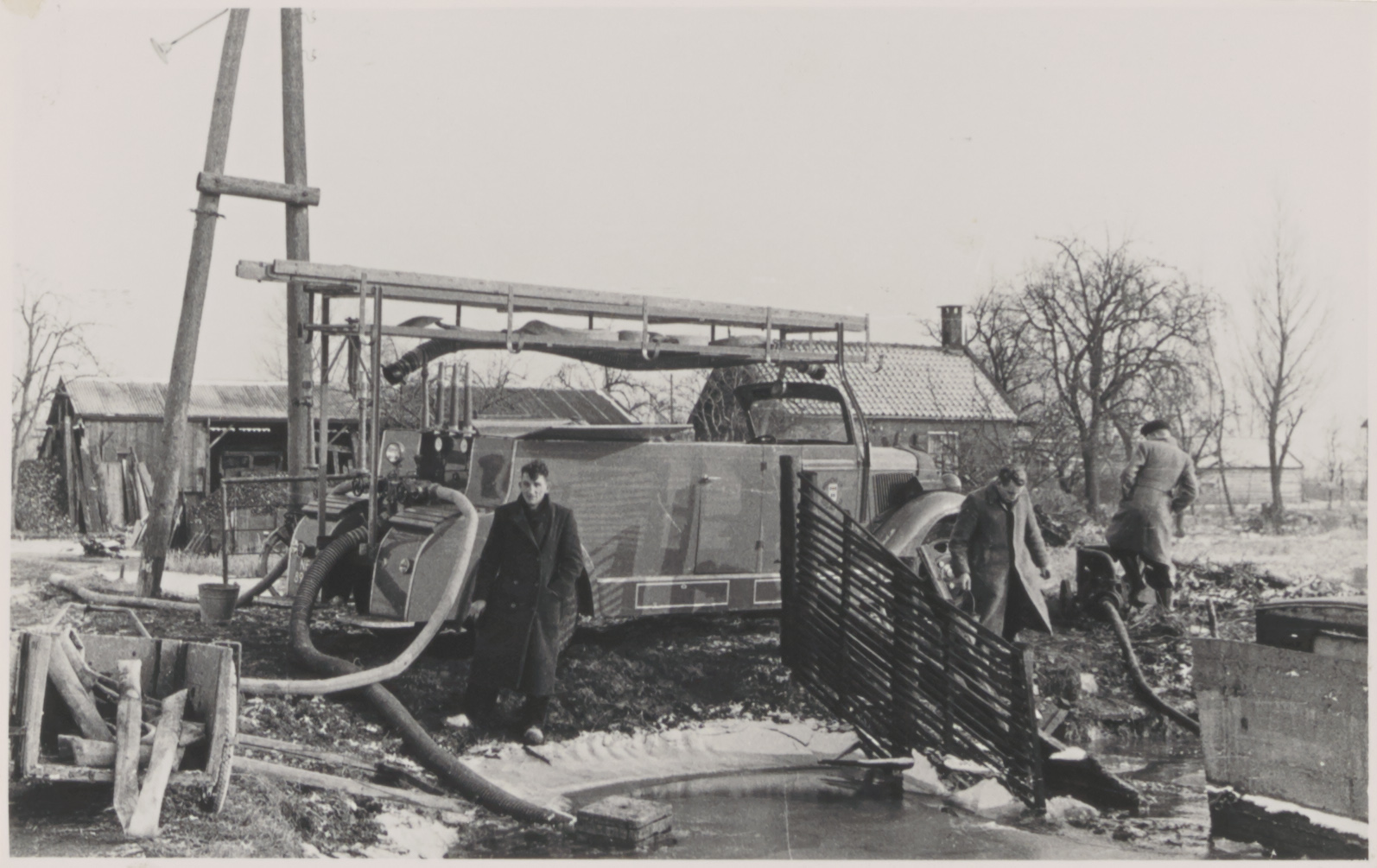 Het gas is dicht en de vrijwillige brandweer pompt het water weg van plaatsen waar het te lang blijft staan, hier op de Noordzijde nabij nr. 32, bewoond door A.A. Meerkerk. Op de voorgrond staat Piet Aantjes.