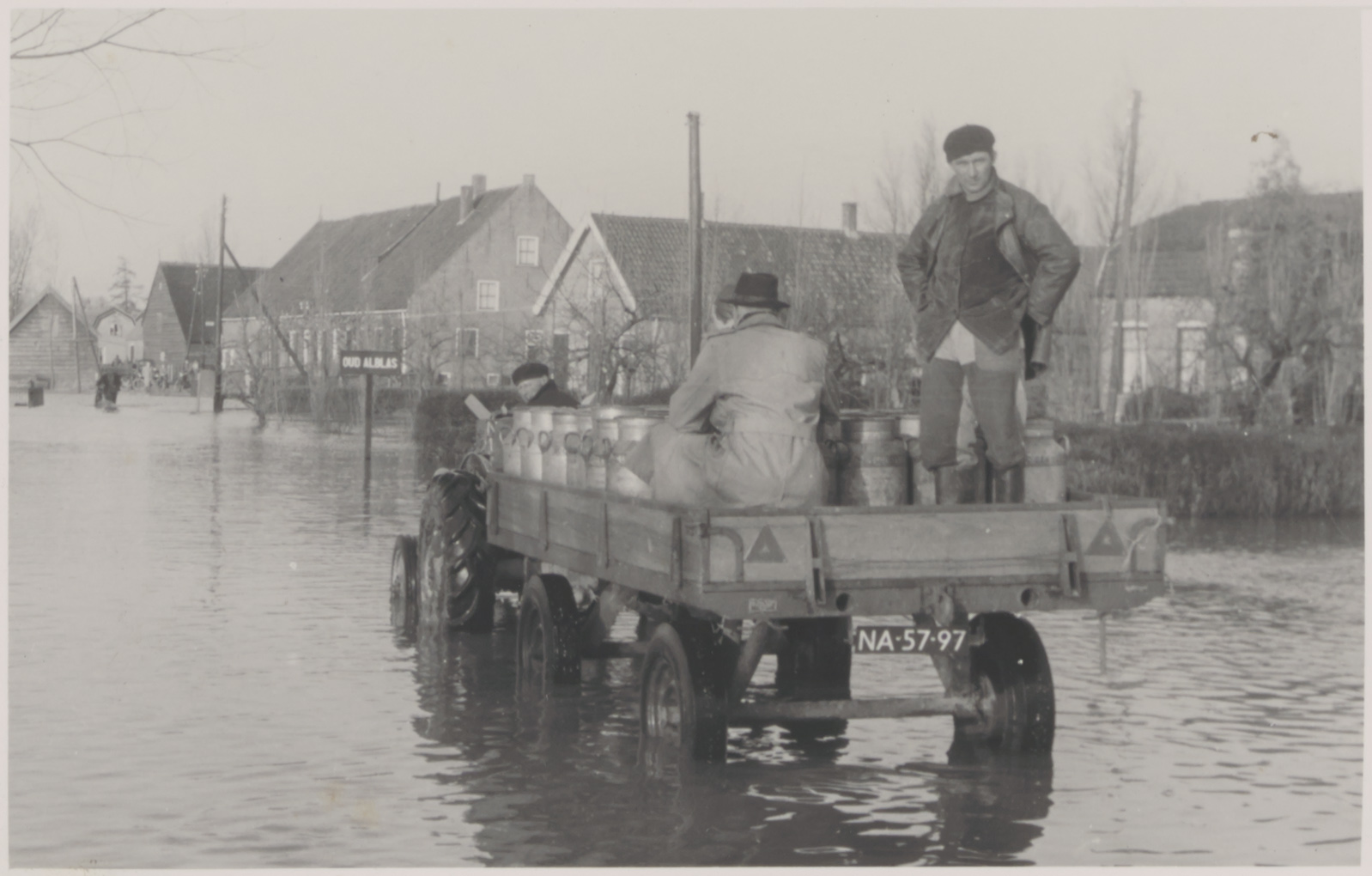 - Melk ophalen met trekker en wagen op het Oosteinde. Op de trekker G.N. Eijkelenboom. Op de wagen staat Adr. Breedveld.