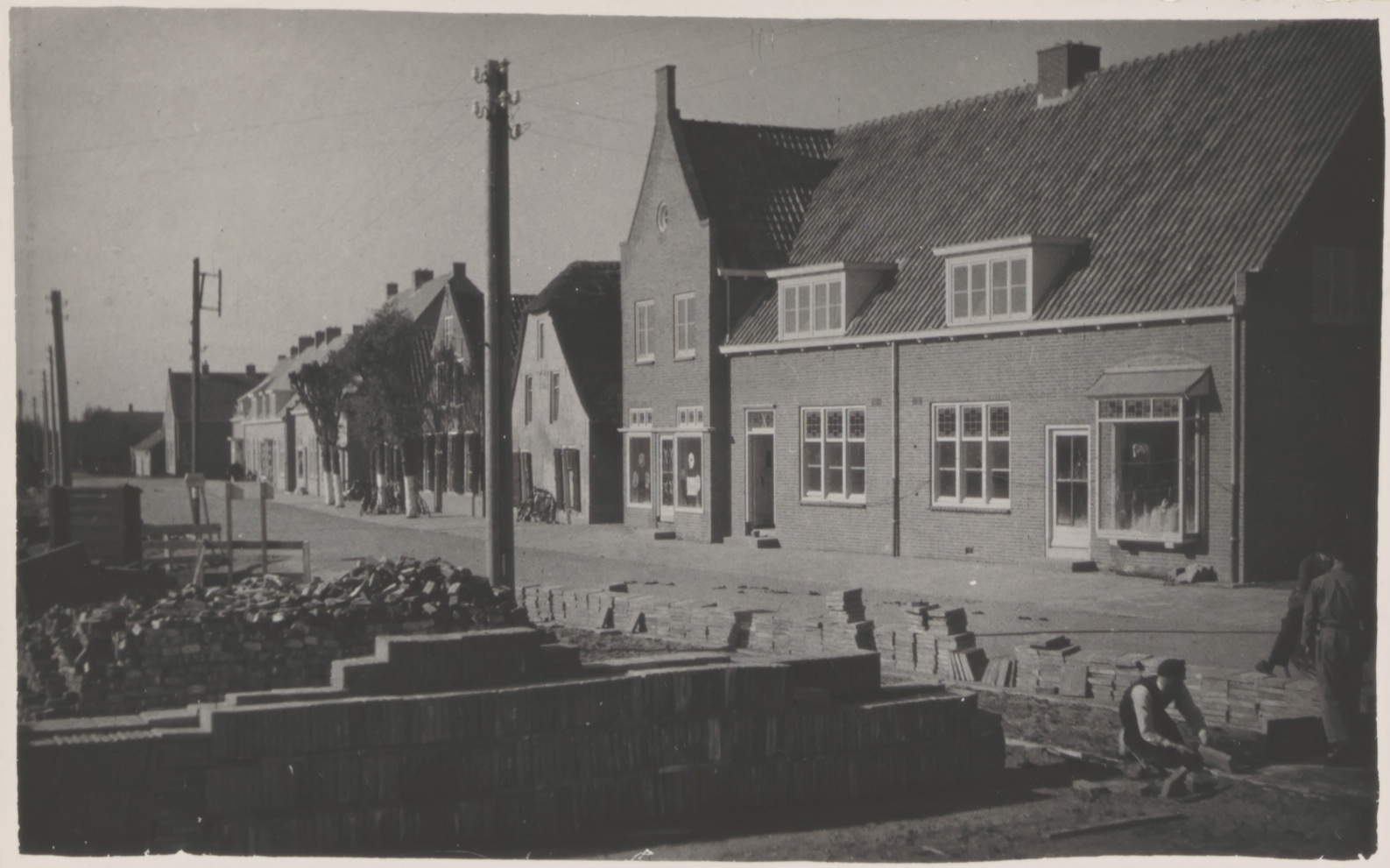 Herbouwde panden na het bombardement van 12 mei 1940 in Kerkstraat in Bleskensgraaf, gezien in westelijke richting.