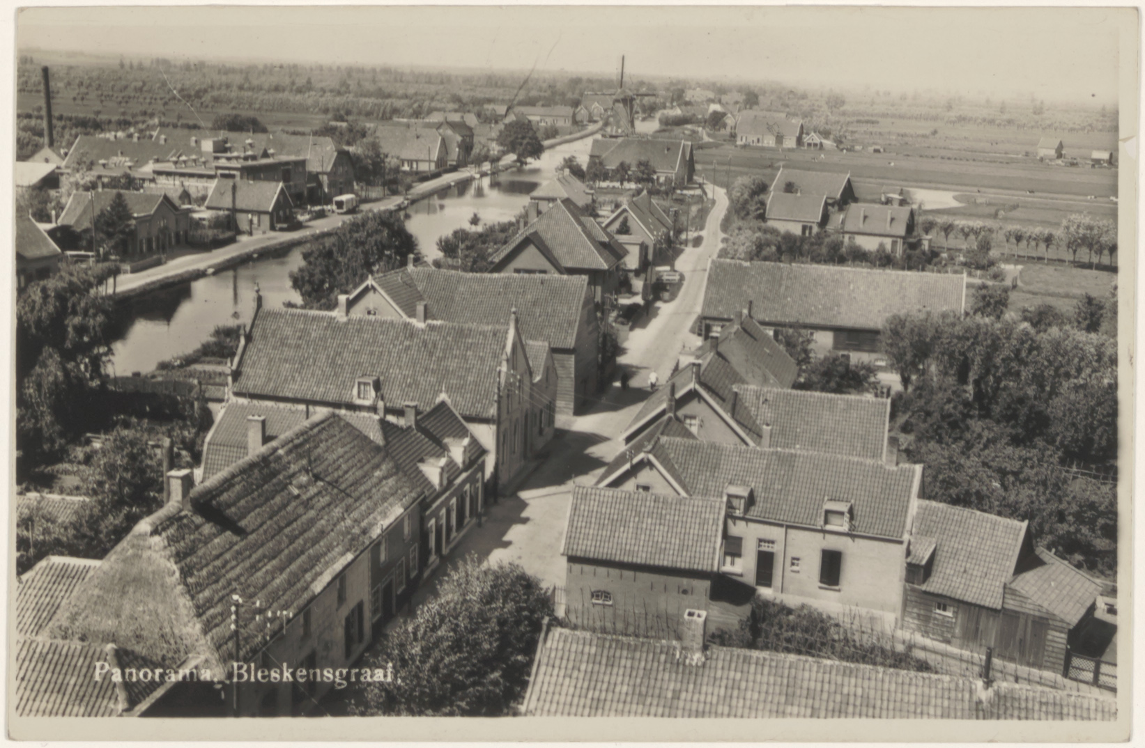 Vanaf de toren van de hervormde Kerk in Bleskensgraaf zicht op de Kerkstraat en de molen de Vriendschap. Links de Graafstroom en Dorpsstraat met de melkfabriek De Graafstroom.gezien in westelijke richting.