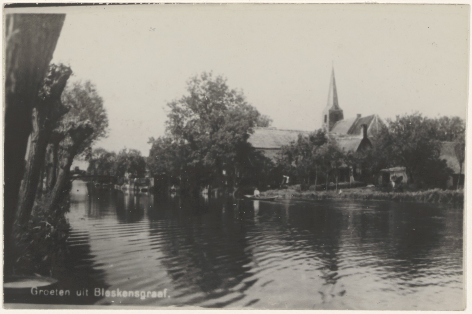 Vanaf Hofwegen zicht over de Graafstroom met de Hervormde Kerk aan de Kerkstraat. gezien vanaf nummer 49 in Bleskensgraaf.
