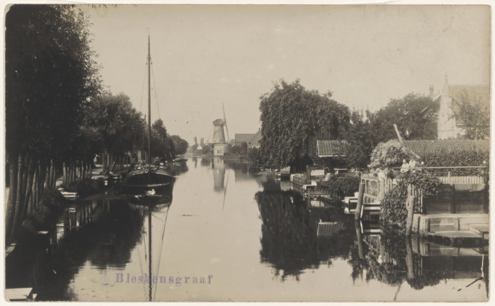 Graafstroom vanaf de brug met links de Dorpsstraat en rechts de kerkstraat en molen De Vriendschap op de achtergrond.