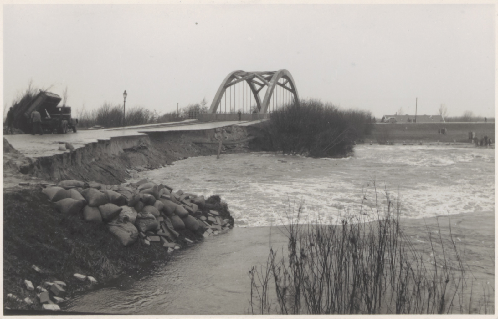 Stukgeslagen Rivierdijk bij de brug over de A15 in Sliedrecht tijdens de watersnood.