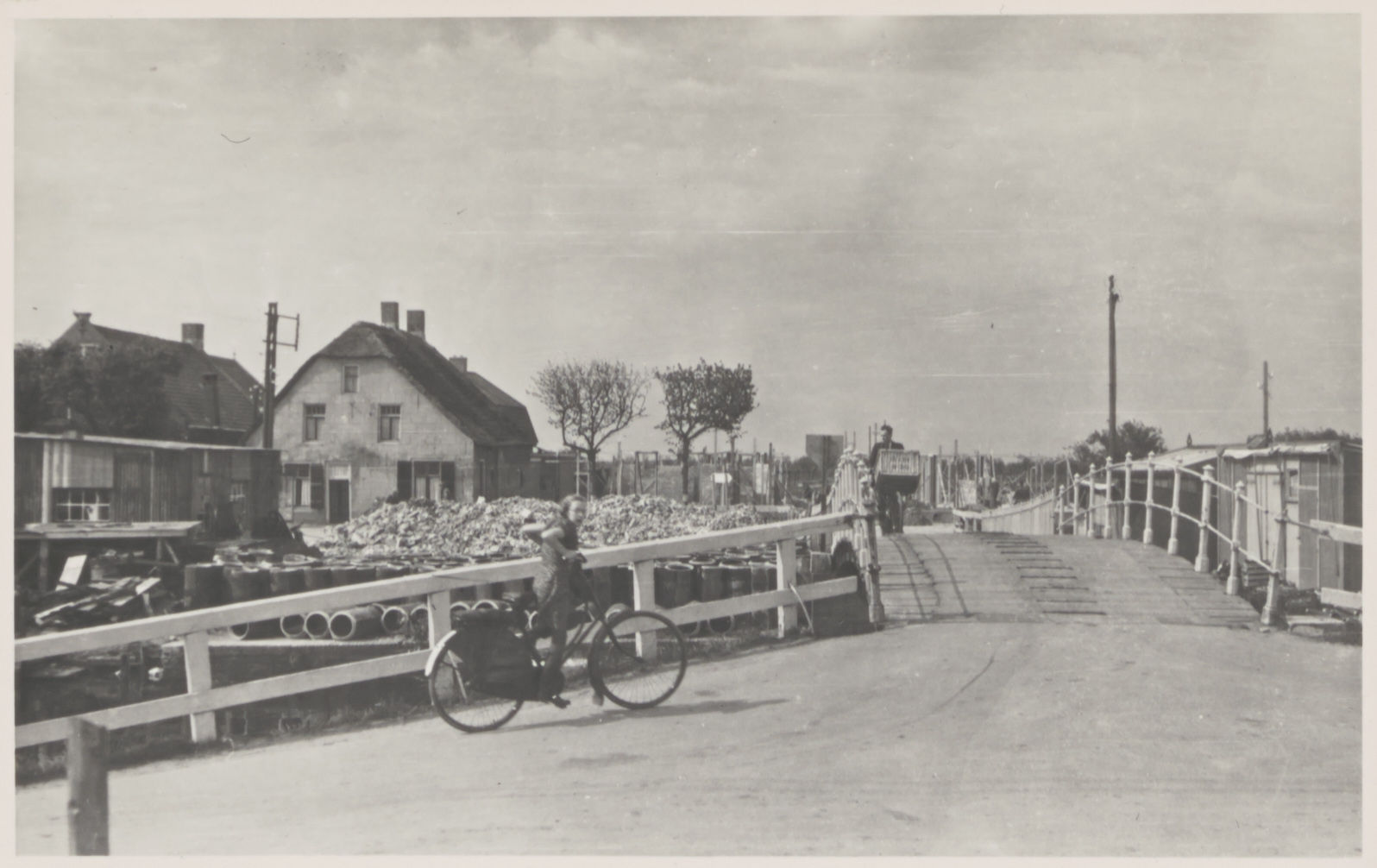 Vanaf de Dorpsstraat brug over de Graafstroom met de ravage na het bombardement op 12 mei 1940 in Bleskensgraaf.