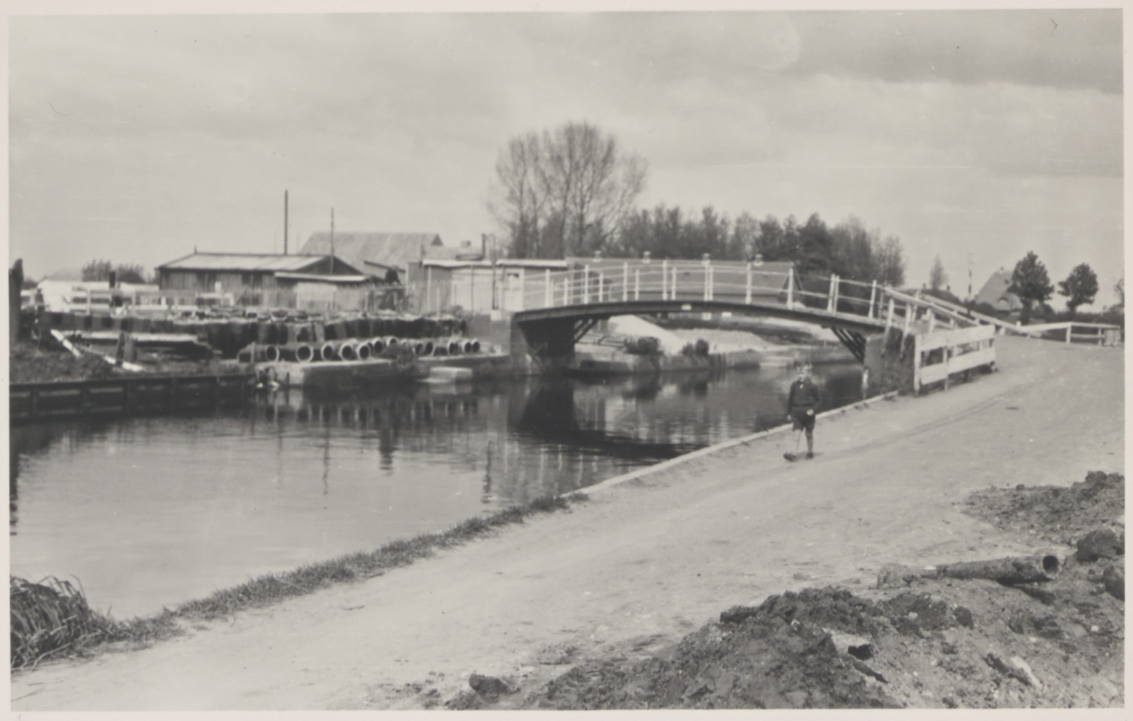 Brug over de Graafstroom vanaf de Dorpsstraat naar de Kerkstraat met de ravage na het bombardement op 12 mei 1940 in Bleskensgraaf.