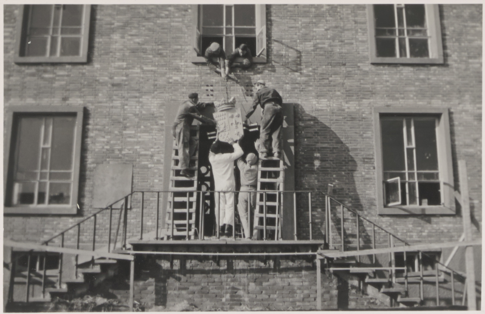 Bevestiging van het gemeentewapen op het gemeentehuis aan de Kerkstraat in Bleskensgraaf.