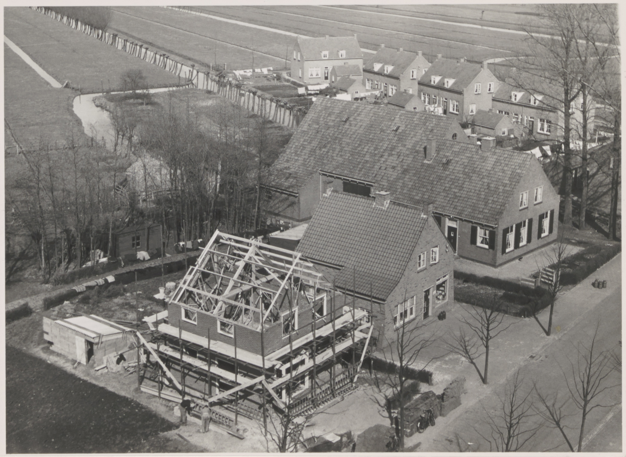 Vanaf de Kerktoren van Bleskensgraaf zicht op de Kerkstraat met de woning nummer 19 in aanbouw.Het blokje rechts boven ligt aan de Burg.dekkingstraat.