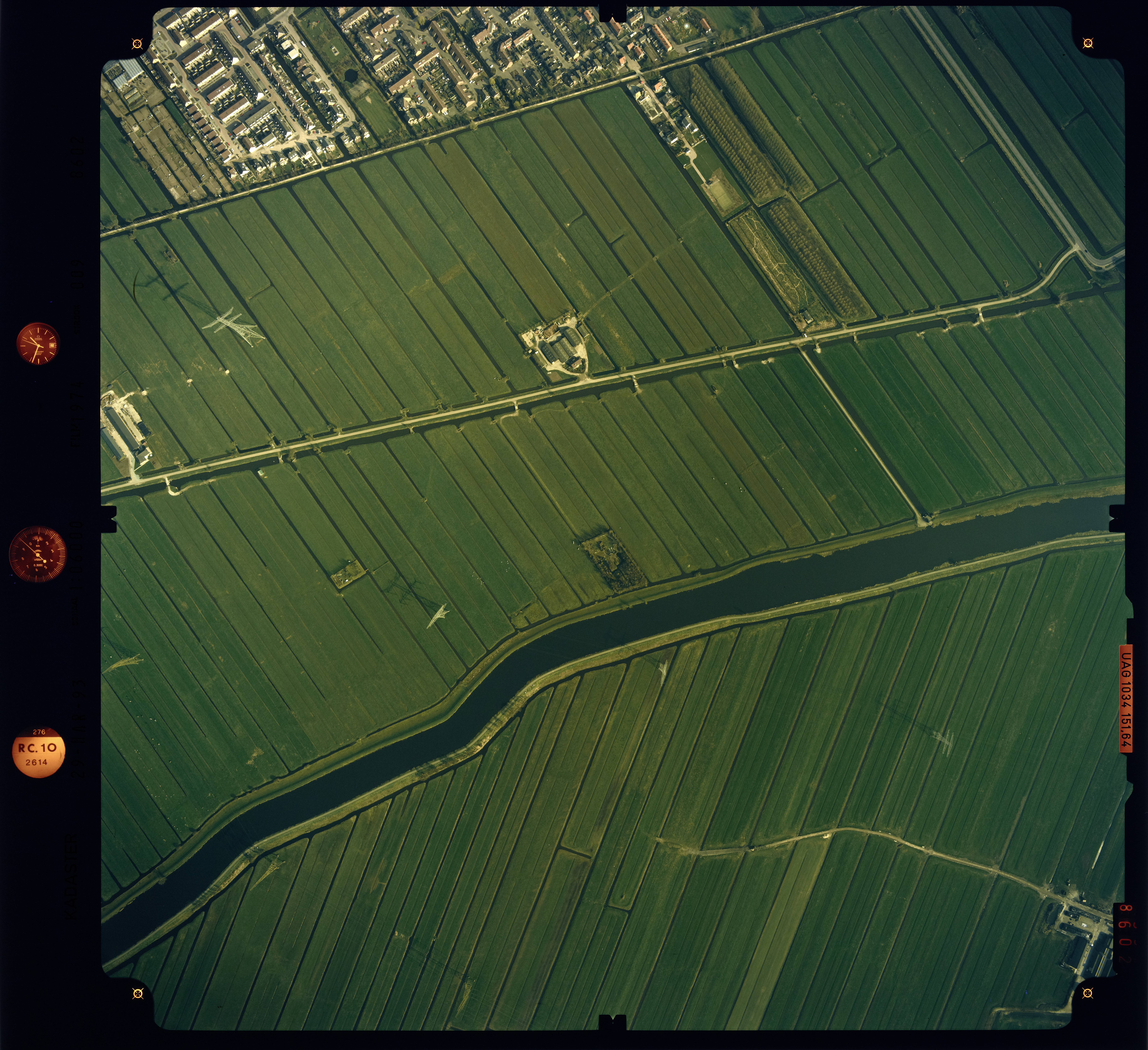 Luchtfoto nabij Nieuw Lekkerland 1993. Links onder naar midden rechts Groote of Achterwatering. Midden links naar midden rechts Elzenweg. Rechts boven N480. Boven van links naar rechts Tiendweg met Nieuw Lekkerland er boven.