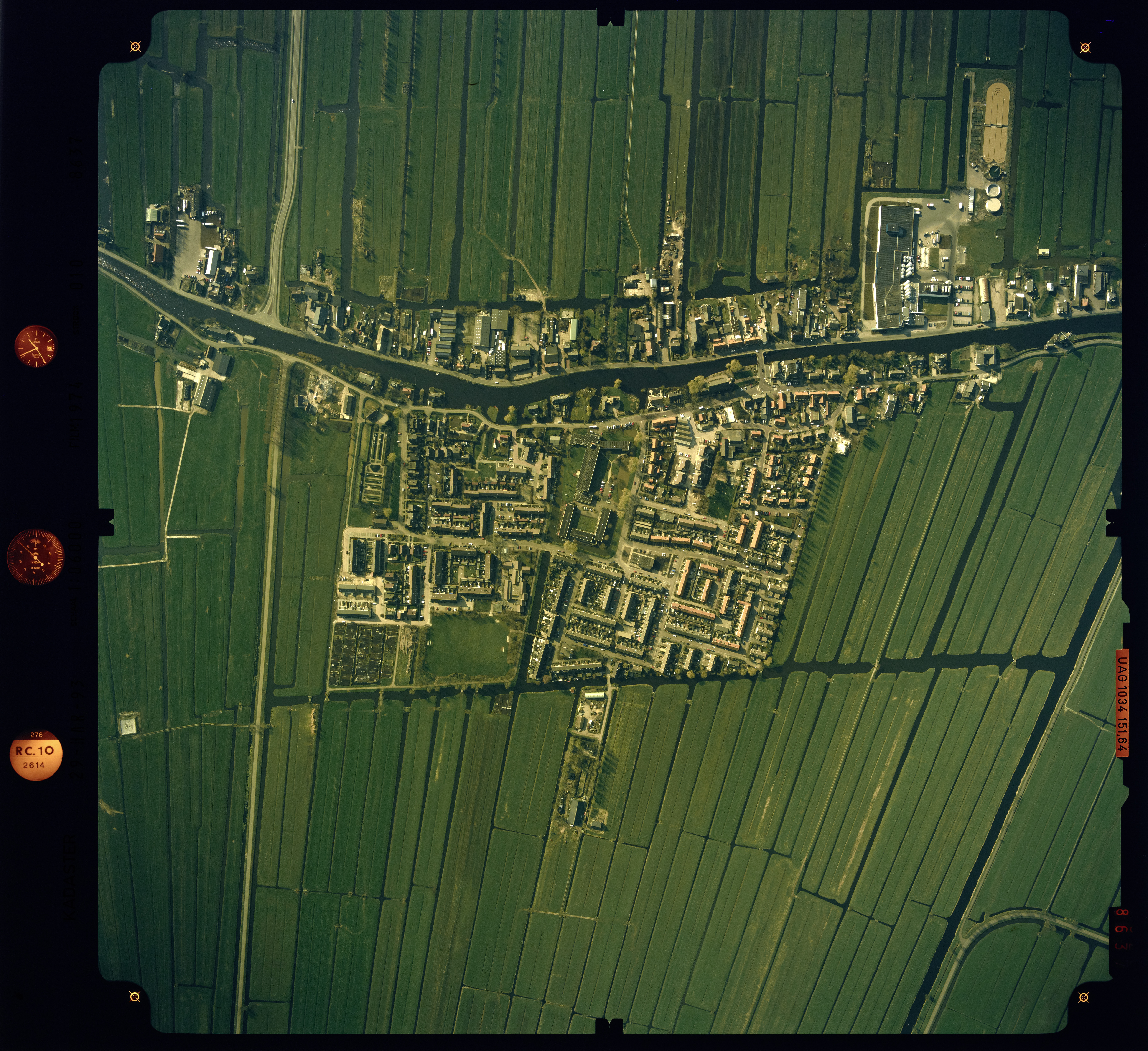Luchtfoto Bleskensgraaf 1993. Links onder naar boven Zeemansweg. Links boven naar onder Wervenkampweg. vlnr De Graafstroom . gezien in zuidelijke richting.