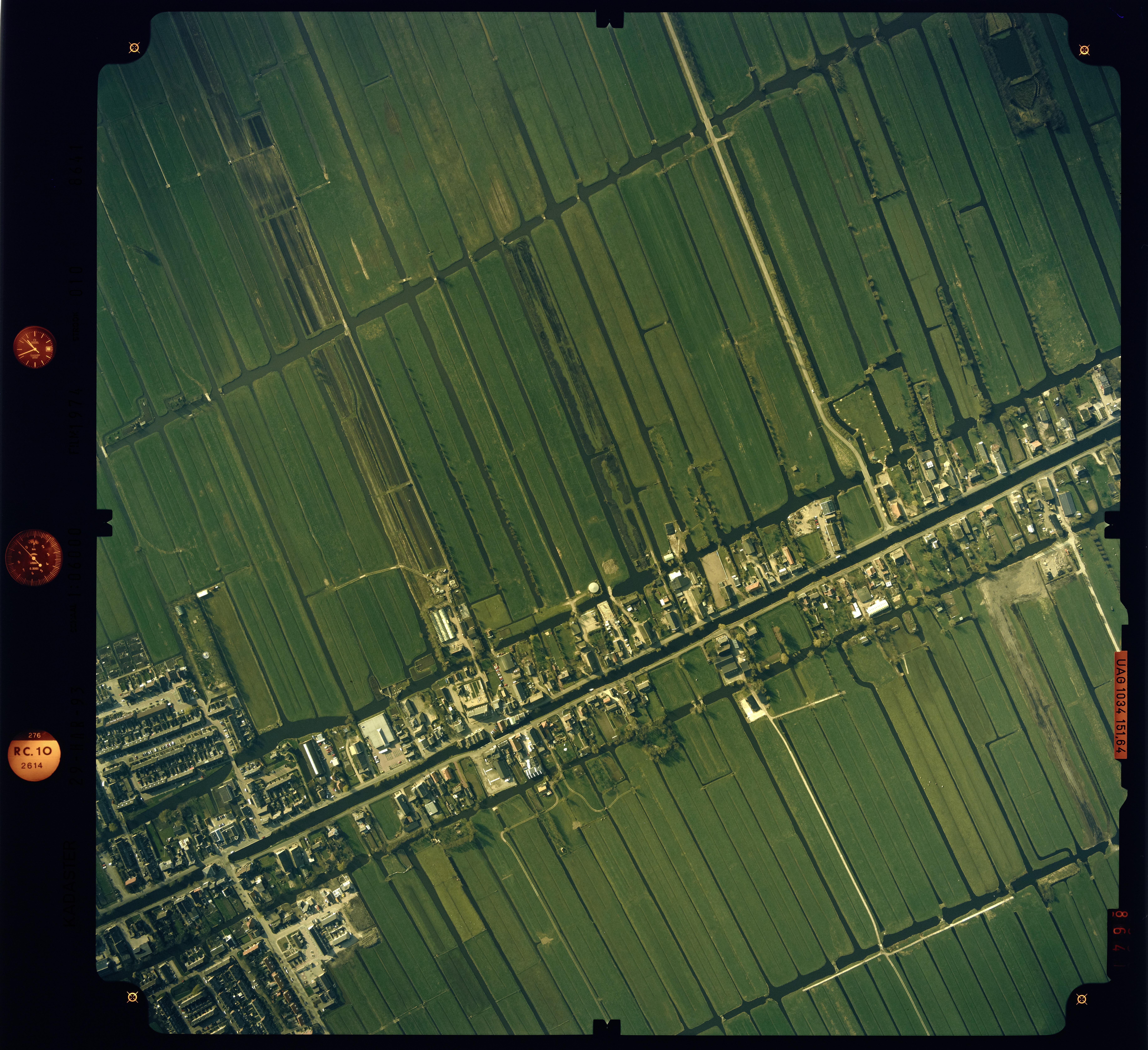 Luchtfoto Molenaarsgraaf boven en Brandwijk onder 1993. Links onder naar Midden rechts Graafstroom met Dorpsstraat/Graafdijk west boven de Graafstroom en Gijbelandsedijk onder. Midden boven naar onder Polderweg west. gezien in zuidelijke richting.