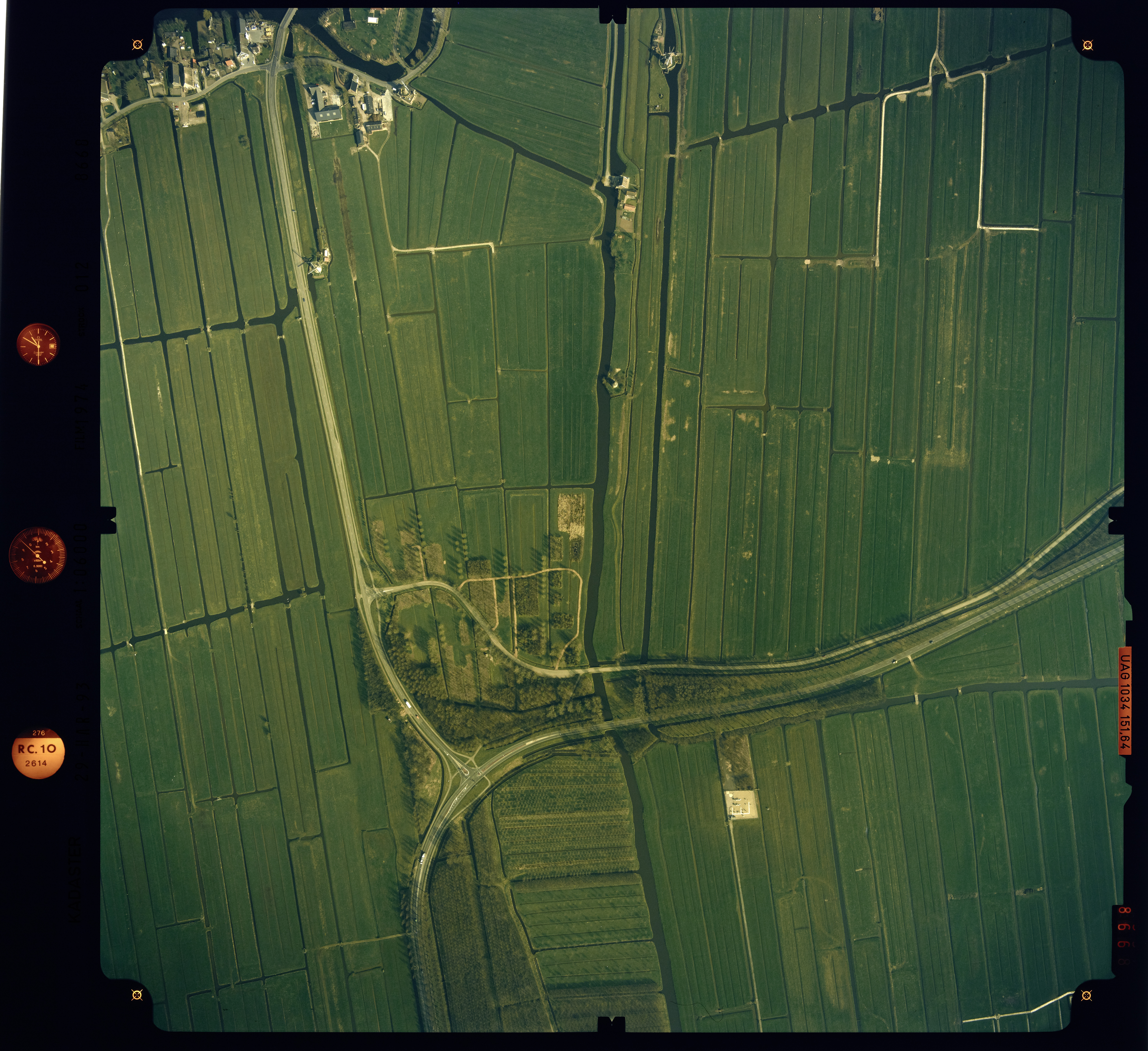 Luchtfoto Oud Alblas 1993: Midden onder naar rechts midden Prov.weg N214. Links boven naar onder N481. Links boven Oud Alblas met Oosteinde. gezien in noordelijke richting