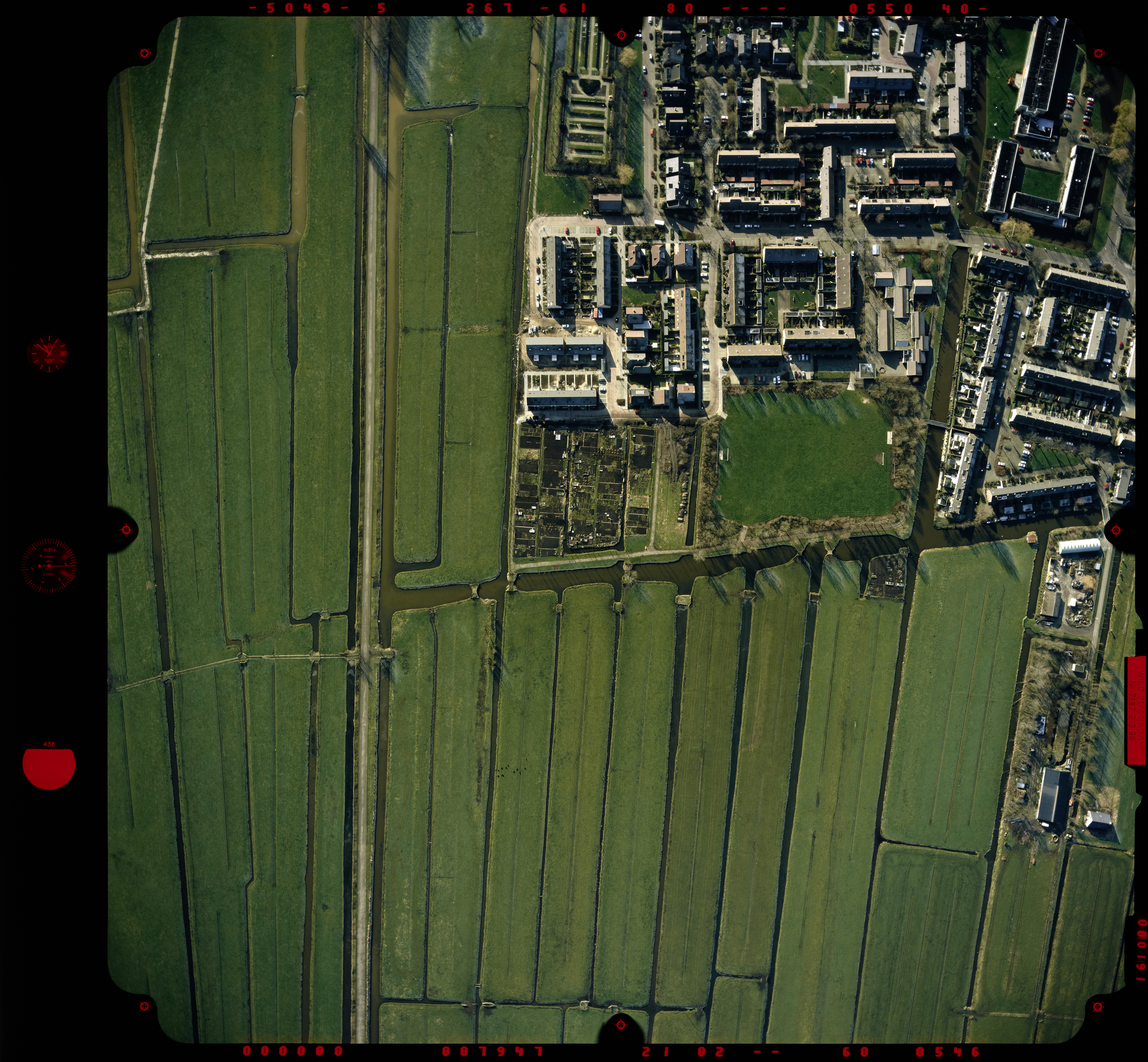 Luchtfoto Bleskensgraaf 1993: Links onder naar links boven Zeemansweg. Rechts onder Koekoekspad. Midden school met de Bijbel/Koolmeesstraat. gezien in zuidelijke richting.