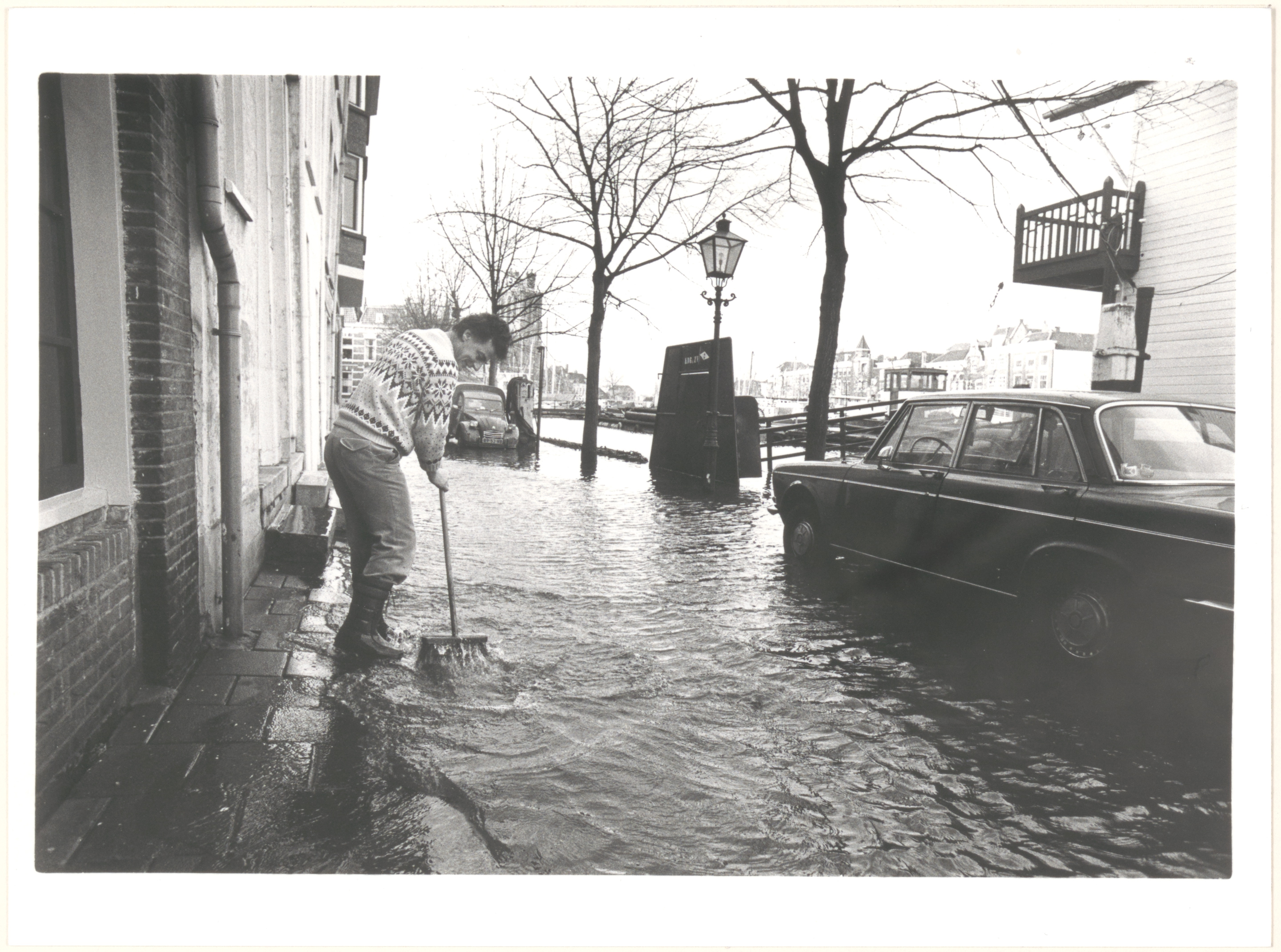 Hoogwater op de Knolhaven. Rechts het botenhuis van de roei- en zeilvereniging, op de achtergrond de Nieuwe Haven.