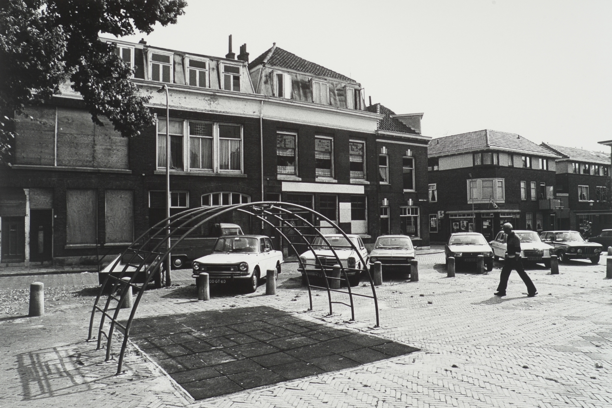 Speeltoestel en geparkeerde auto's aan het Weeshuisplein. In de achtergrond de …