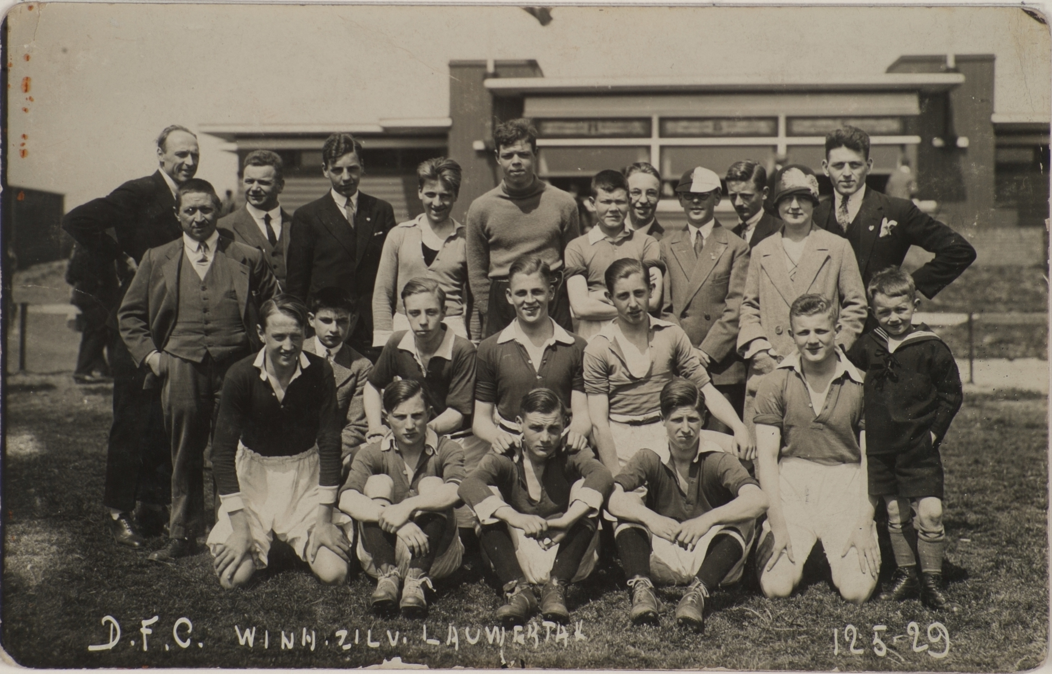 Groepsfoto van DFC bij het winnen van de zilveren lauwertak. Achterste rij, 5e van …