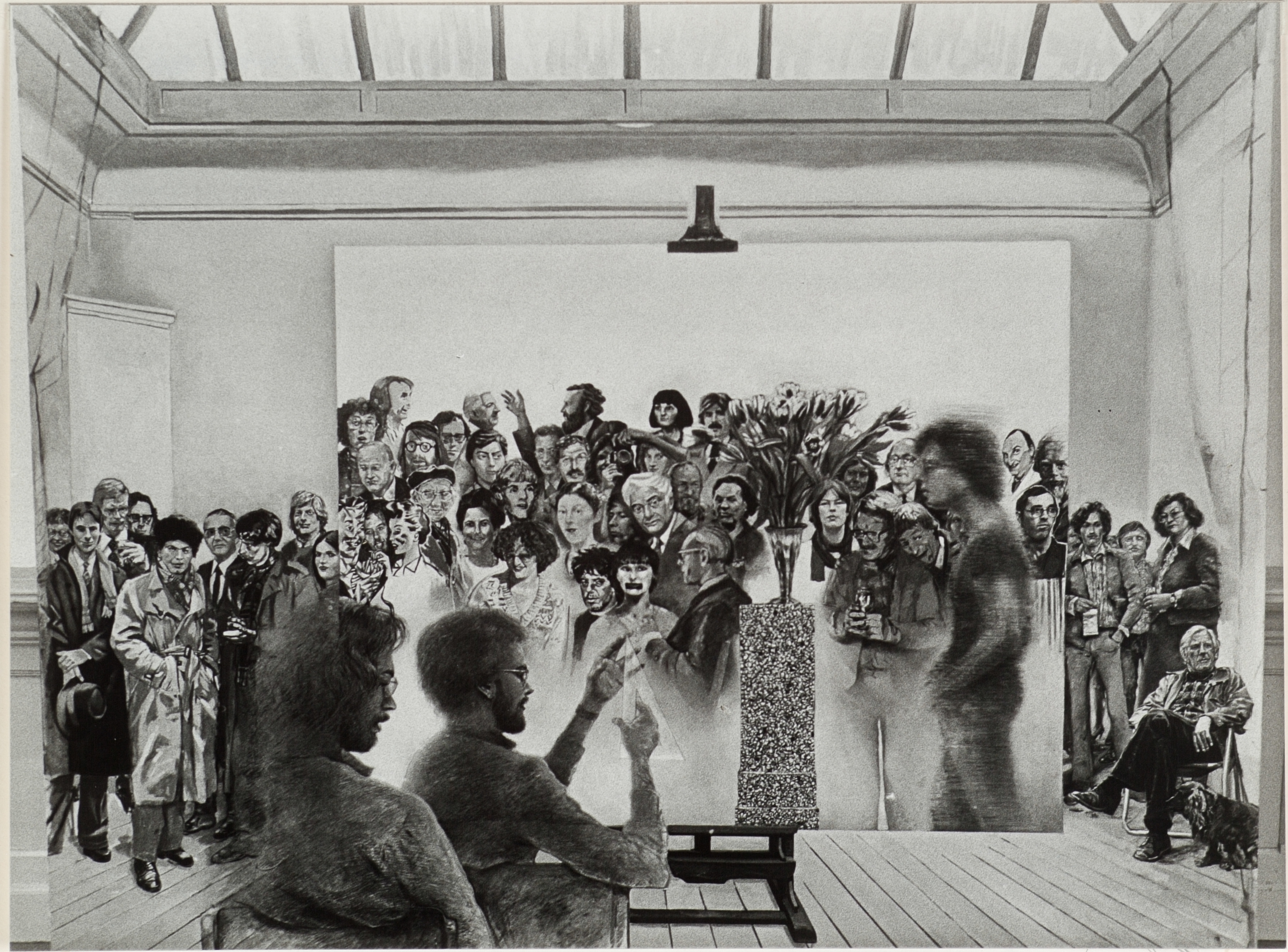 Schilderij met Dordtse portretten gemaakt door Led Brand, Jan Kleingeld en Henk van Dalen in de tentoonstellingszaal van Pictura tussen 16 februari en 9 maart 1980 tijdens de tentoonstelling "14 kunstenaars werkend in Pictura", het schilderij is nooit voltooid.