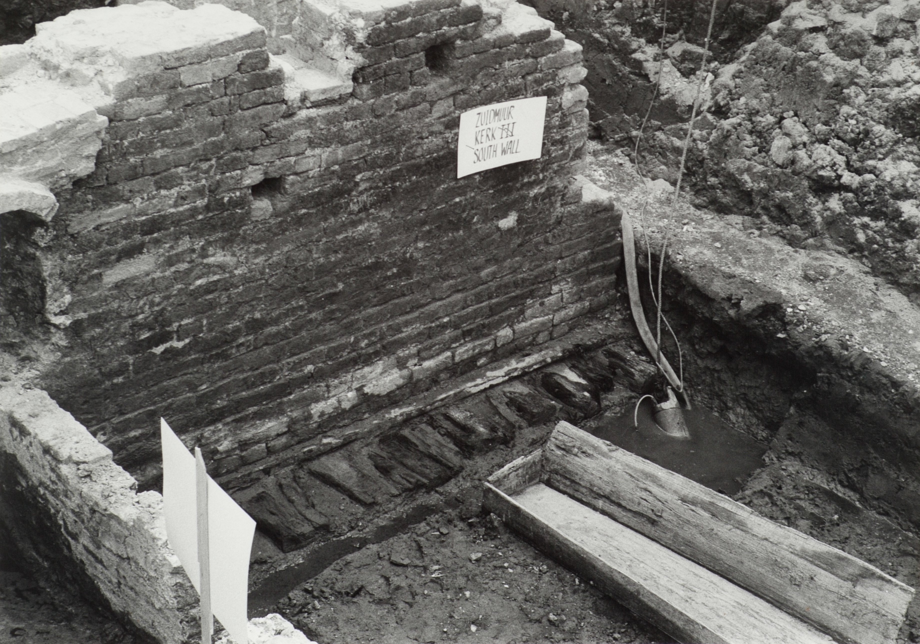 Een muur op balken van een scheepshuid in de opgraving van het Minderbroederklooster.