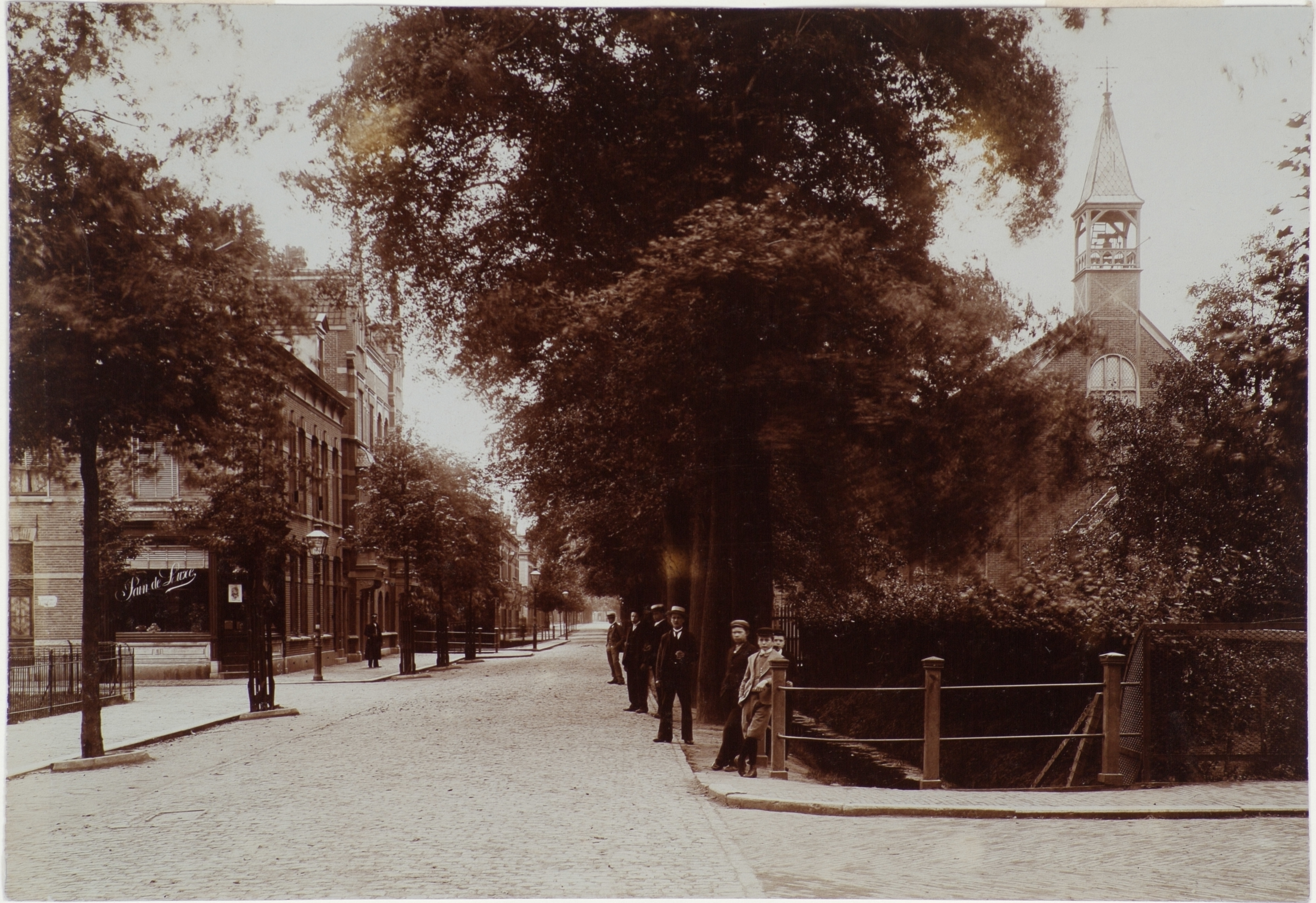 Van Strijsingel ter hoogte van de Koninginnestraat. Rechts de R.K. Hulpkerk, links de …