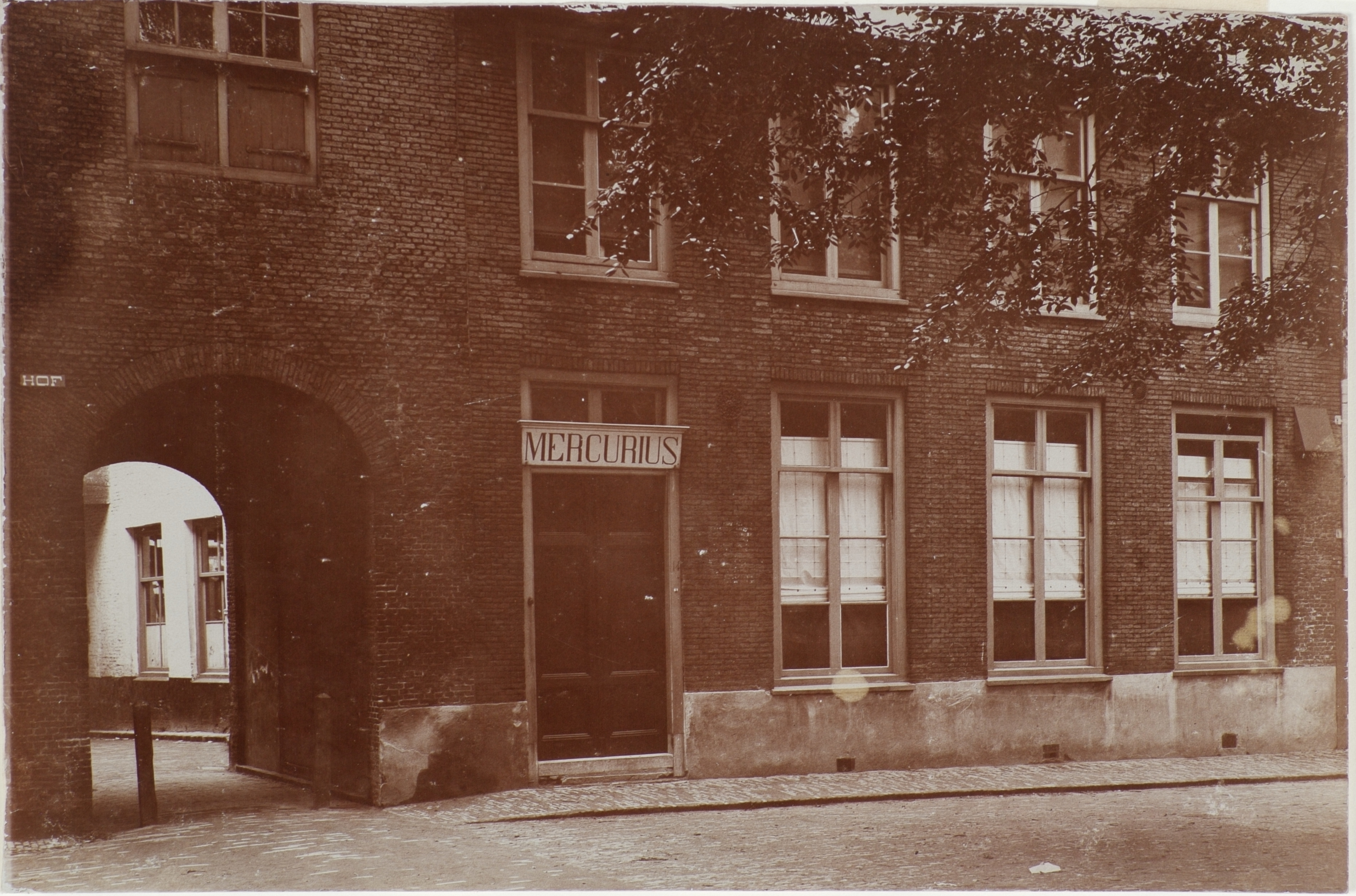 - Mercurius, Nationale Bond van Handels-en kantoorbedienden in het Hof. Links de doorgang naar de Voorstraat.