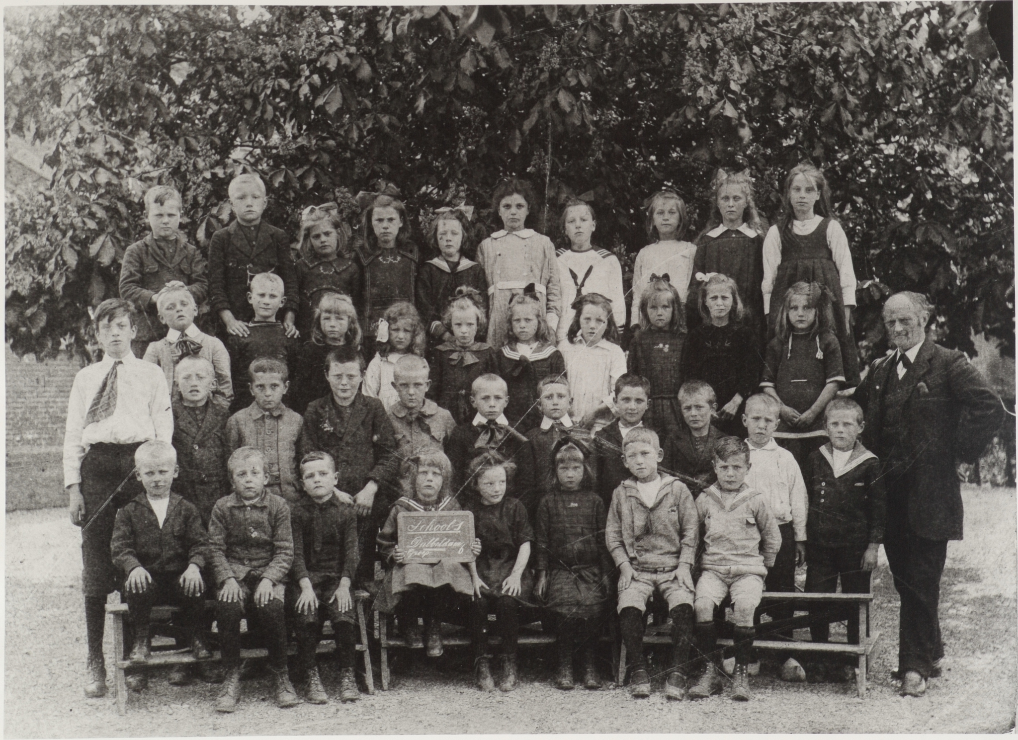 - originele foto gemaakt door "E. Jacobs, voorheen Amsterdam, thans Rotterdam Bloemfonteinstraat 36" achterste rij v.l.n.r. W. van Valen, B. de Bruin, T. in 't Veld, ..in 't Veld (x Kwakernaat), A.G. Pieren, ...van der Linden (x Schenk), ..Karel?, ...van Es, ...In 't Veld,...Valk 2e rij van achter v.l.n.r. Wim van Bree, C.de Bruin, ... Kraak, ... Faasse, C.Valk, met matrozenkraag ?, ?, ?, ..de Bruin (x Klein), ... van der Laan ( x De Bruin) 3e rij van achter v.l.n.r. Piet Valk (met wit hemd), C. van de Merwe, W. de Bruin, T.D. pieren, P. van de Merwe, ... Kraak, ? , D.van der Linden, G. de Bruin, J. Faasse, P.A. Pieren (zoon van onderwijzer?) T.J. Pieren, onderwijzer (geheel rechts) voorste rij v.l.n.r. M.van Valen, W. de Bruin, ? , ...Van Bree (met bord), ? , ?, J.P. van de Merwe, J.W. Karel
