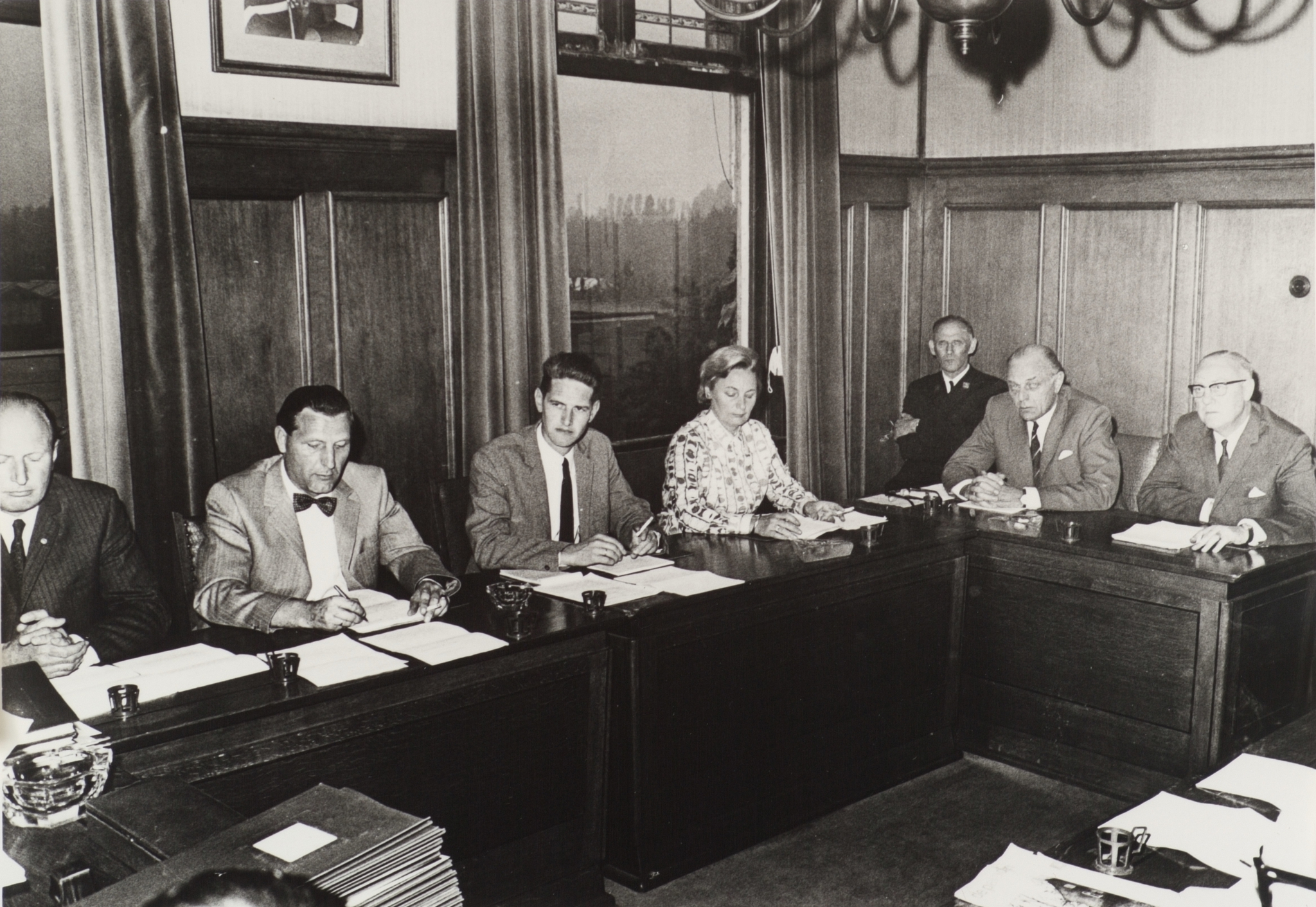 - Een deel van de gemeenteraad van Dubbeldam. V.l.n.r. de heren Klootwijk, Stam, Bouman, mw. Gips, heren W.H. Jas en Langerak; in de hoek gemeentebode P.A. Pieren