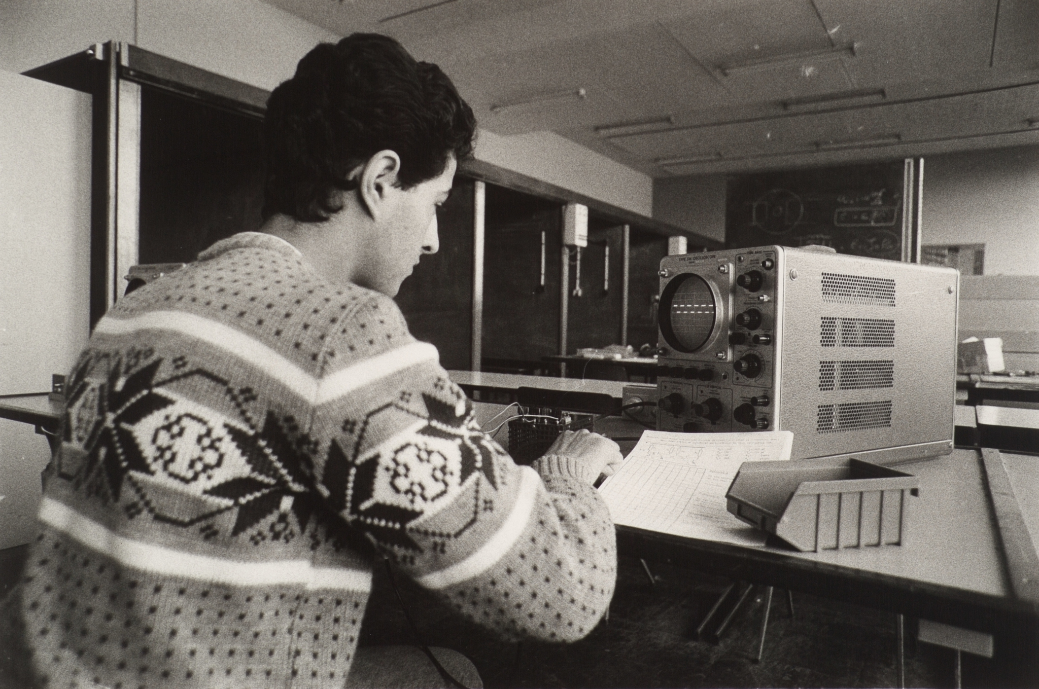 - Foto uit een serie gemaakt voor een artikel in K&T ter gelegenheid van het honderdjarig bestaan van de Ambachtsschool in 1983