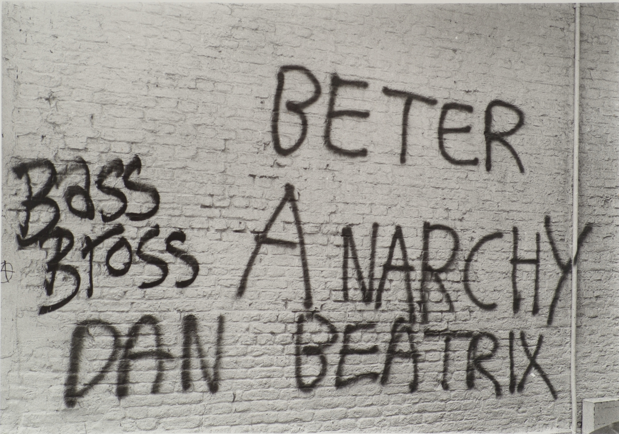 - Graffiti aan een muur op de hoek van de Voorstraat en het Steegoversloot met betrekking tot de inhuldiging van koningin Beatrix