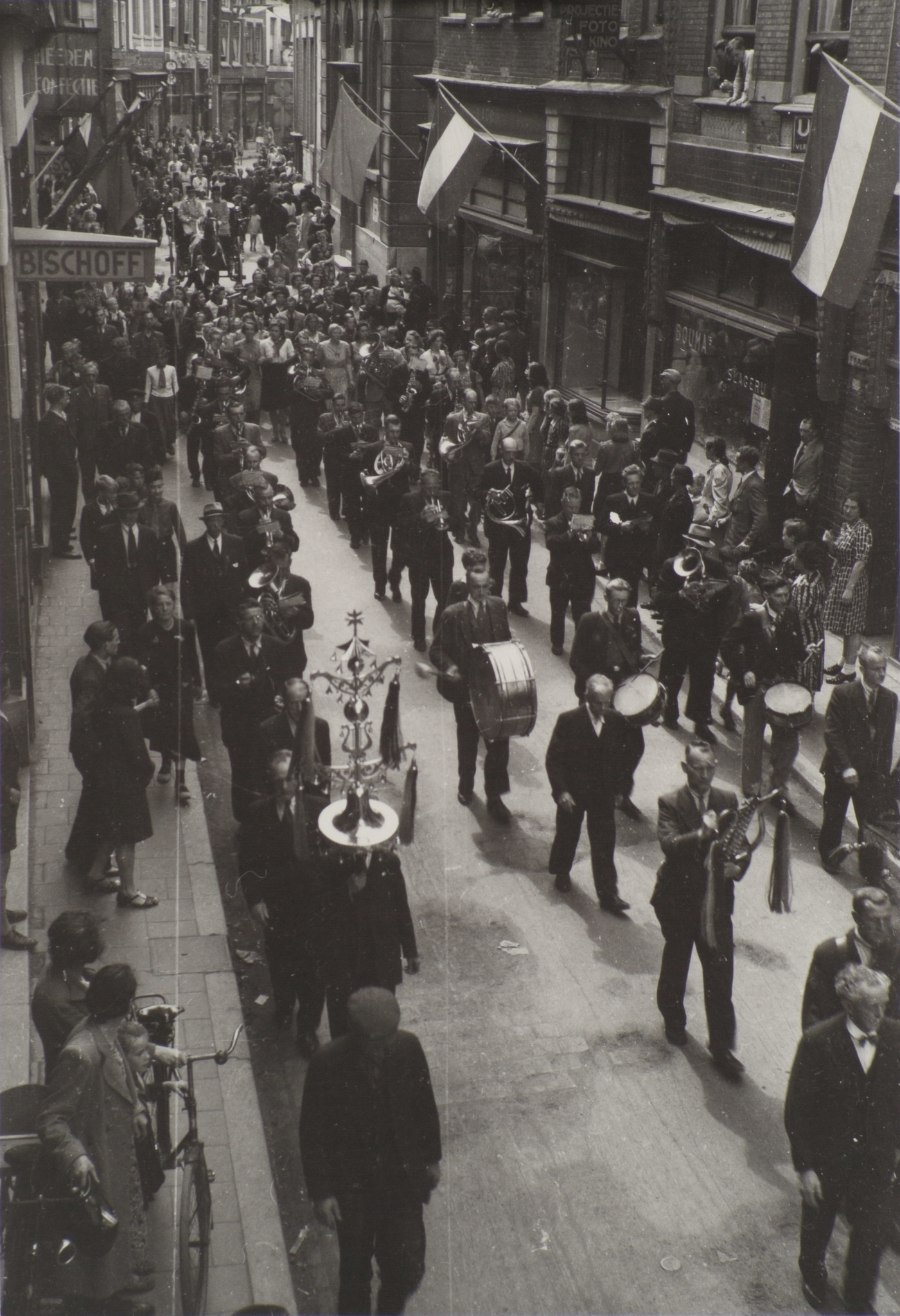 - Optocht ter gelegenheid van de bevrijding, gezien uit het raam bij juwelier De Mey op de Voortstraat