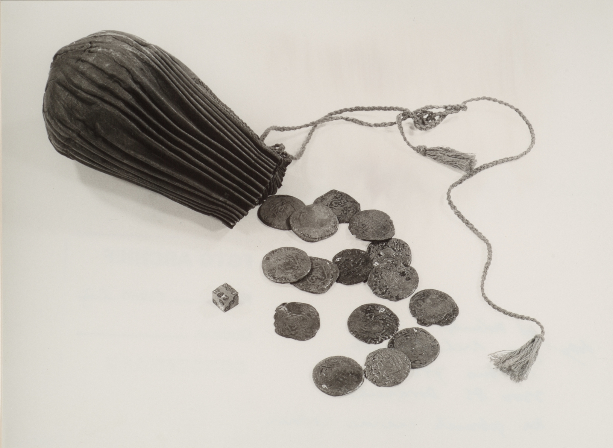 Geldbuidel met 15 oortjes en een dobbelsteentje. De oortjes zijn geslagen tussen 1578 …