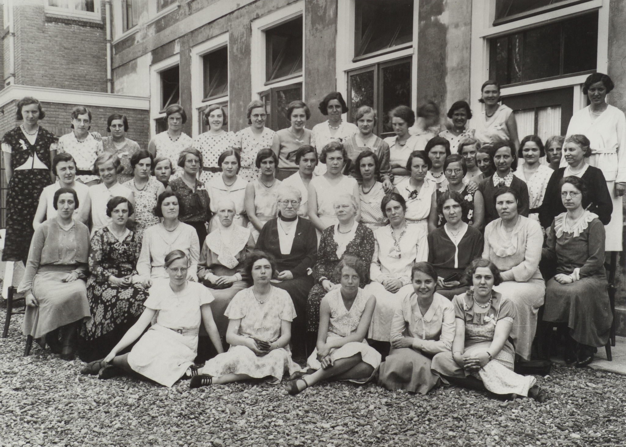 - Zittend op de grond, tweede van links juffrouw Buschmann (kinderverzoerging en opvoeding) Eerste rij zittend v.l.n.r. Juffr. Cohen, De Lange (frans?), Gerda Stille (koken), Van Neck (naaien), Van Berkum (directrice), Slange, Mevr. De Haas (koken), onbekend, Juffr. Sok (naaien), Juffr. De Raad (kostuumnaaien) daarachter de huishoudster van de directrice Staande op de achterste rij: 3e van links Juffr. Van der Meulen (huishoudkunde) en 4e van links Juffr Roelands (kinderverzorging)