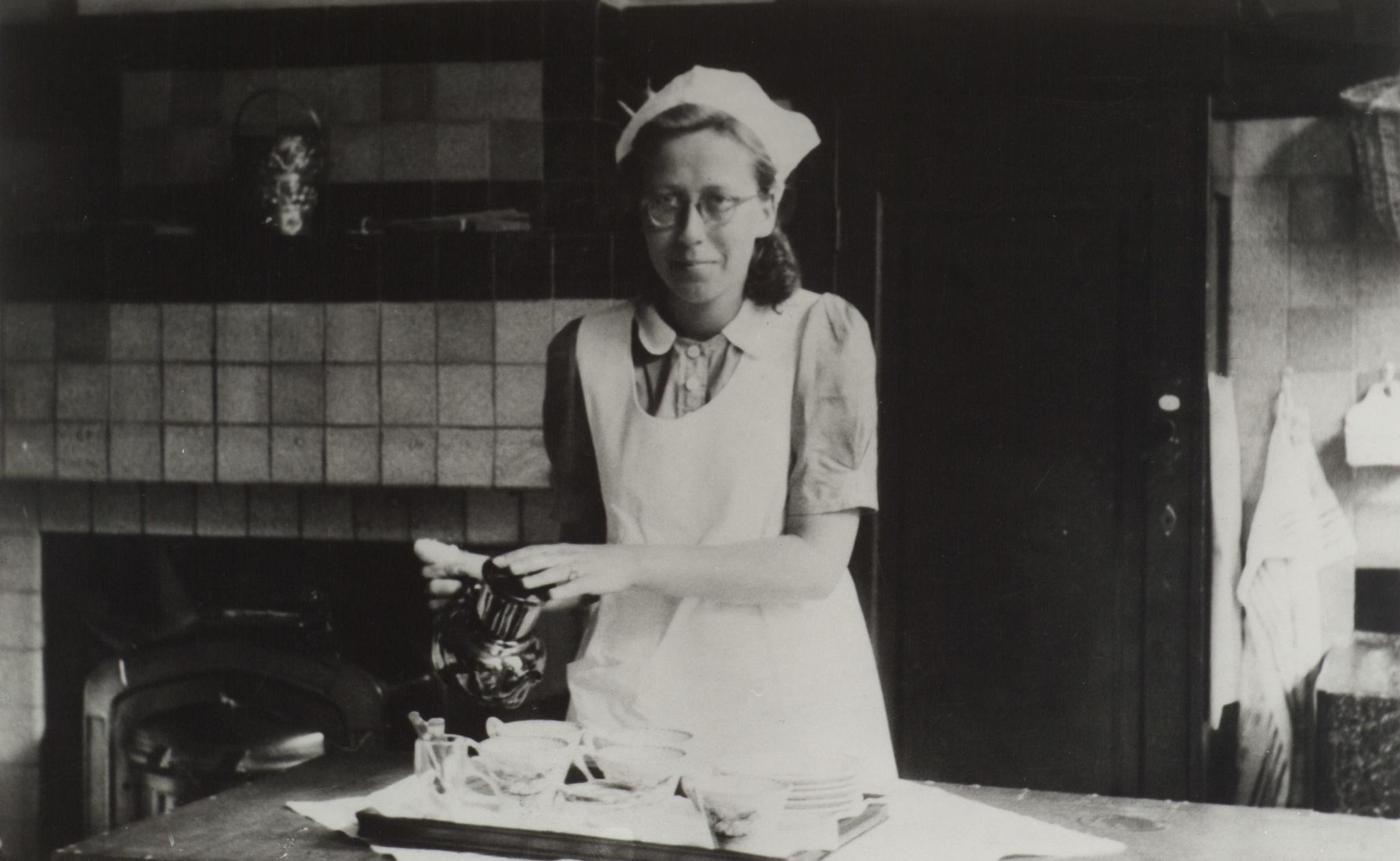 Een leerling van de huishoudschool schenkt koffie in voor de leraressen als dien-oefening