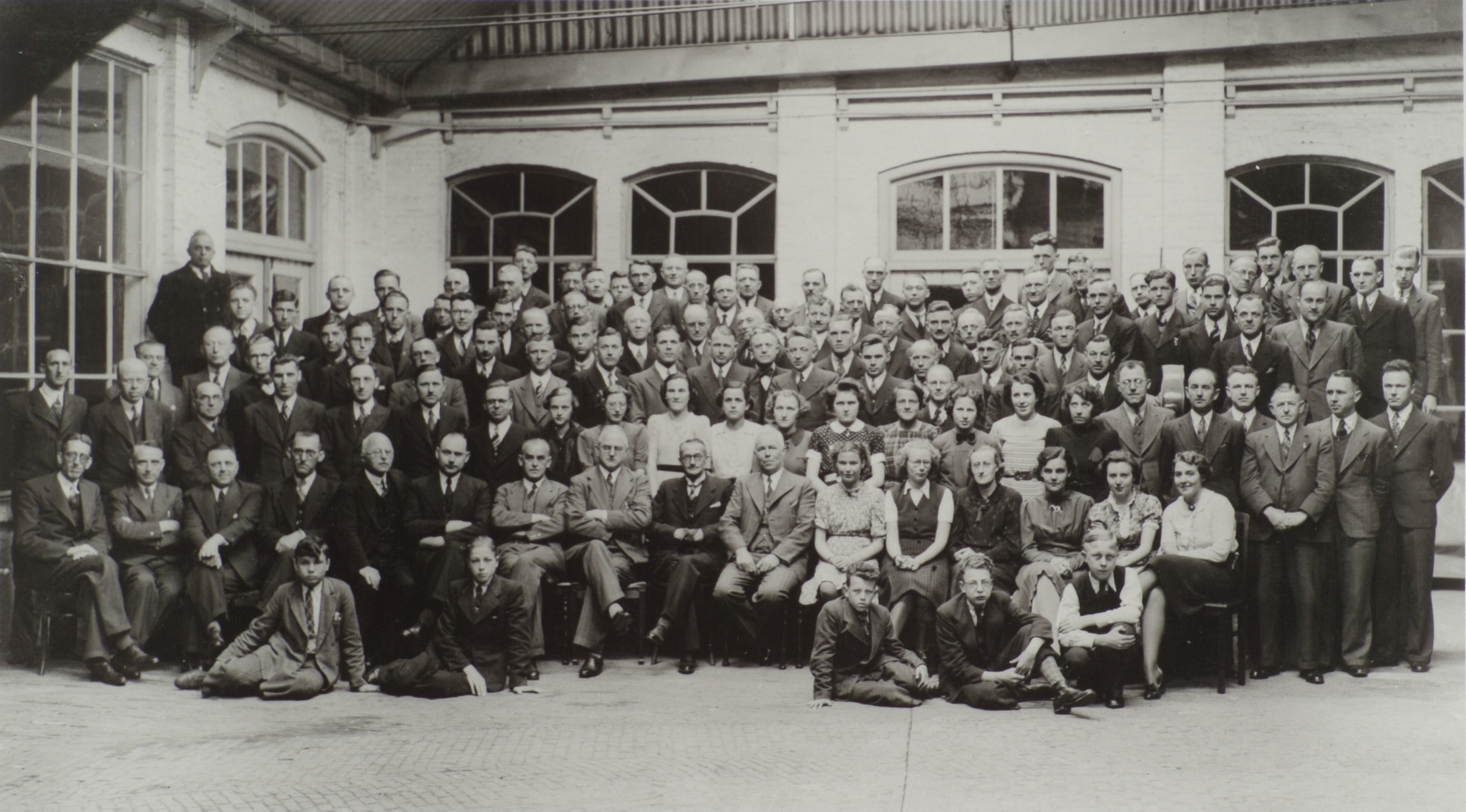 - foto ter gelegenheid van het jubileum van de heer Fromer (middenvoor in donker kostuum) bij de streep Jopie de Vries originele foto door J.van de Weg