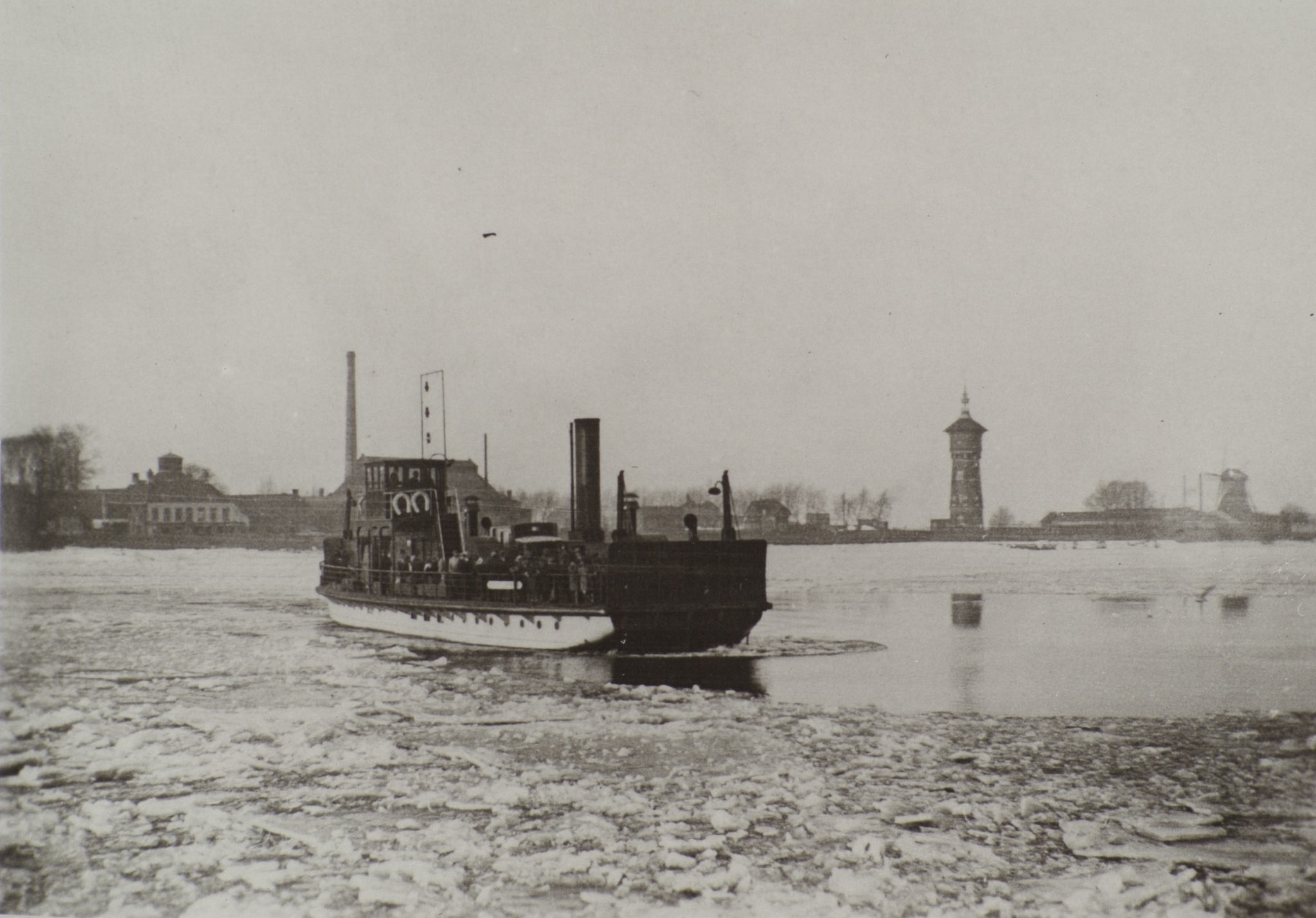 De veerpont op de Oude Maas voor Zwijndrecht in de strenge winter van 1929
