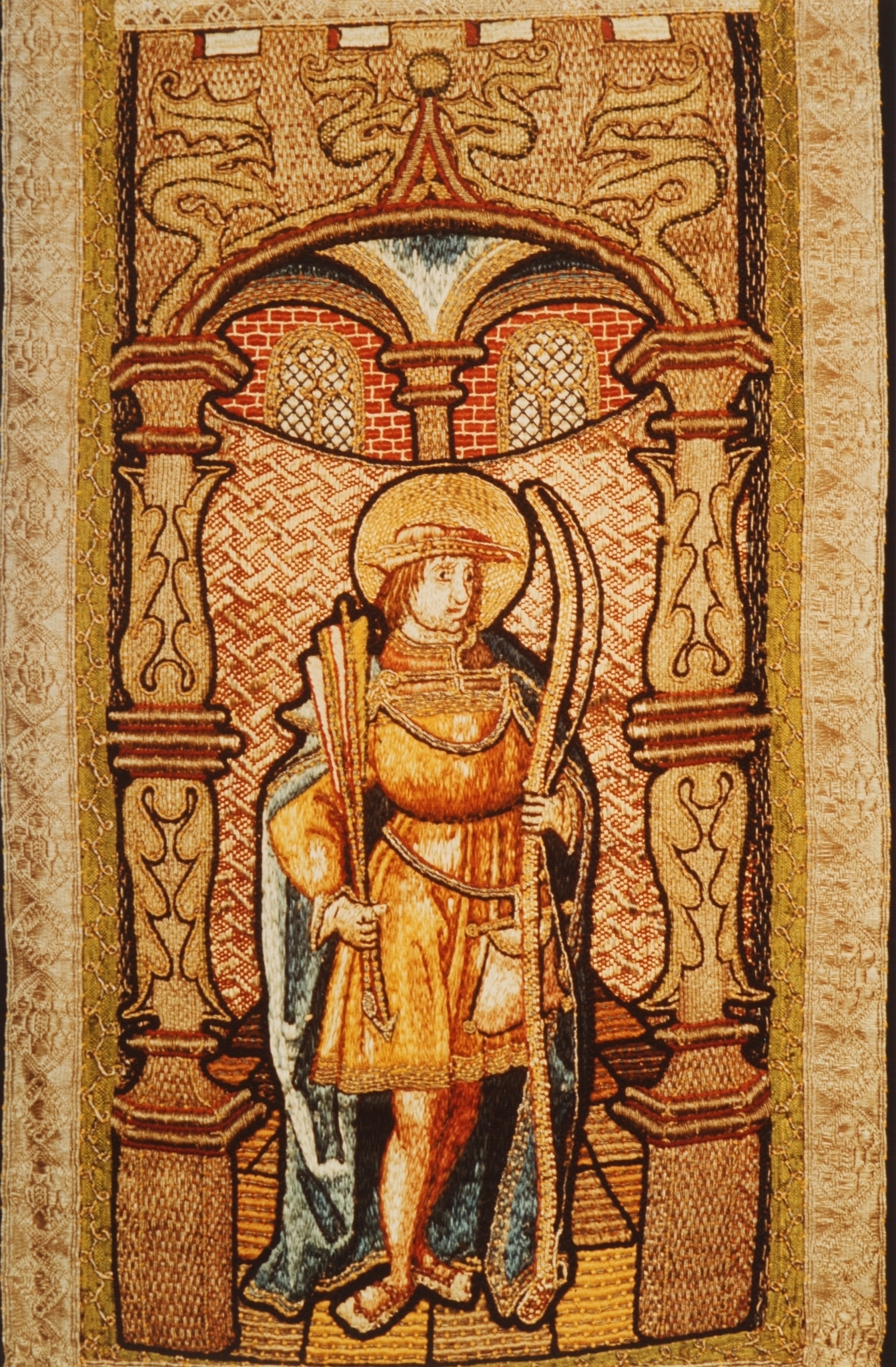 - Detail van een geborduurde koorkap behorend aan de Oud Katholieke kerk met een voorstelling van Sint Sebastiaan