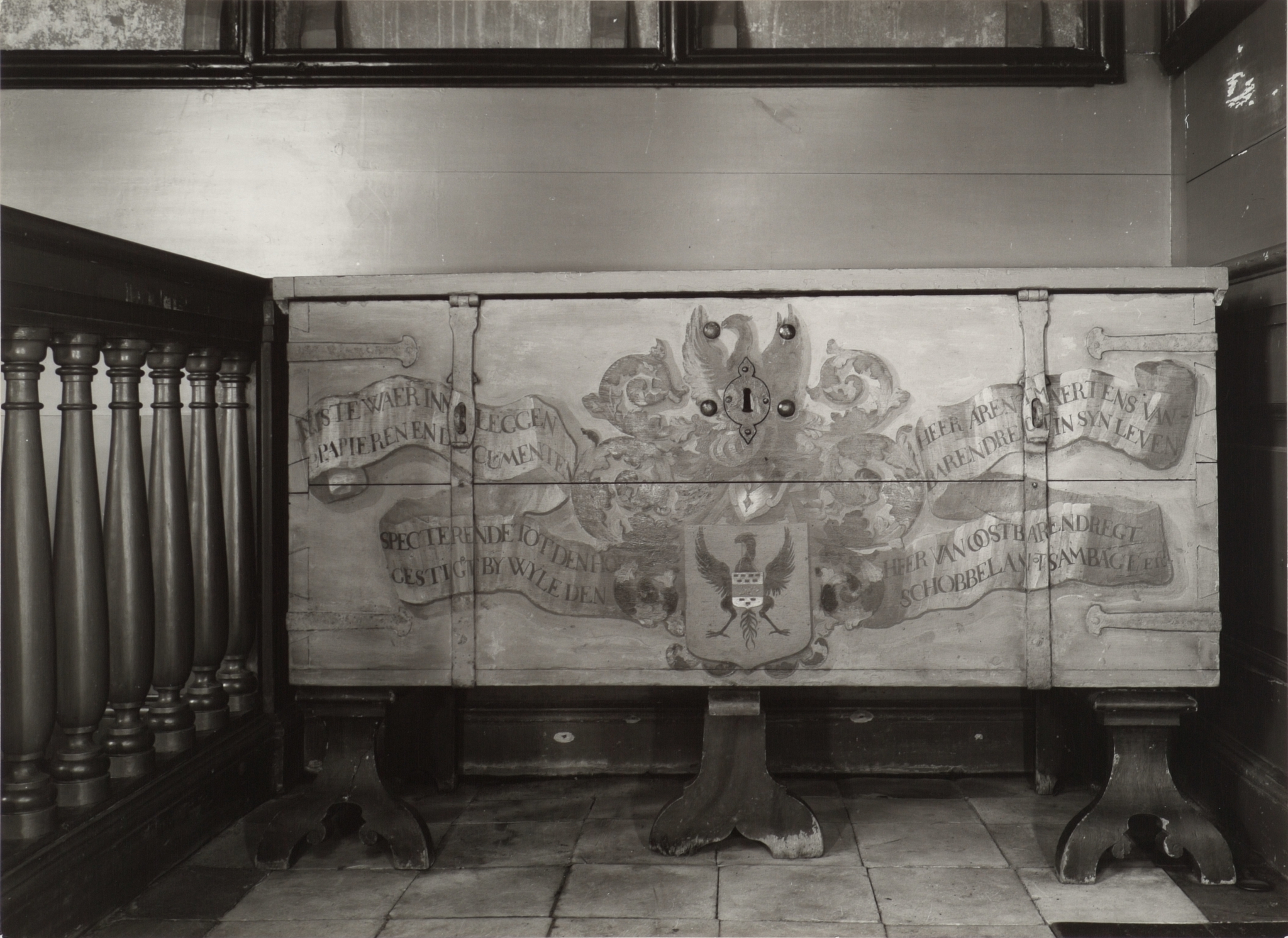 Tekst luidt: Kiste waer in leggen papieren en documenten specterende tot den hof gestigt bij wijle den heer Arent Maertens van Barendrecht in sijn levem heer van Oostbarendrecht Schobbelandts Ambagt etc.