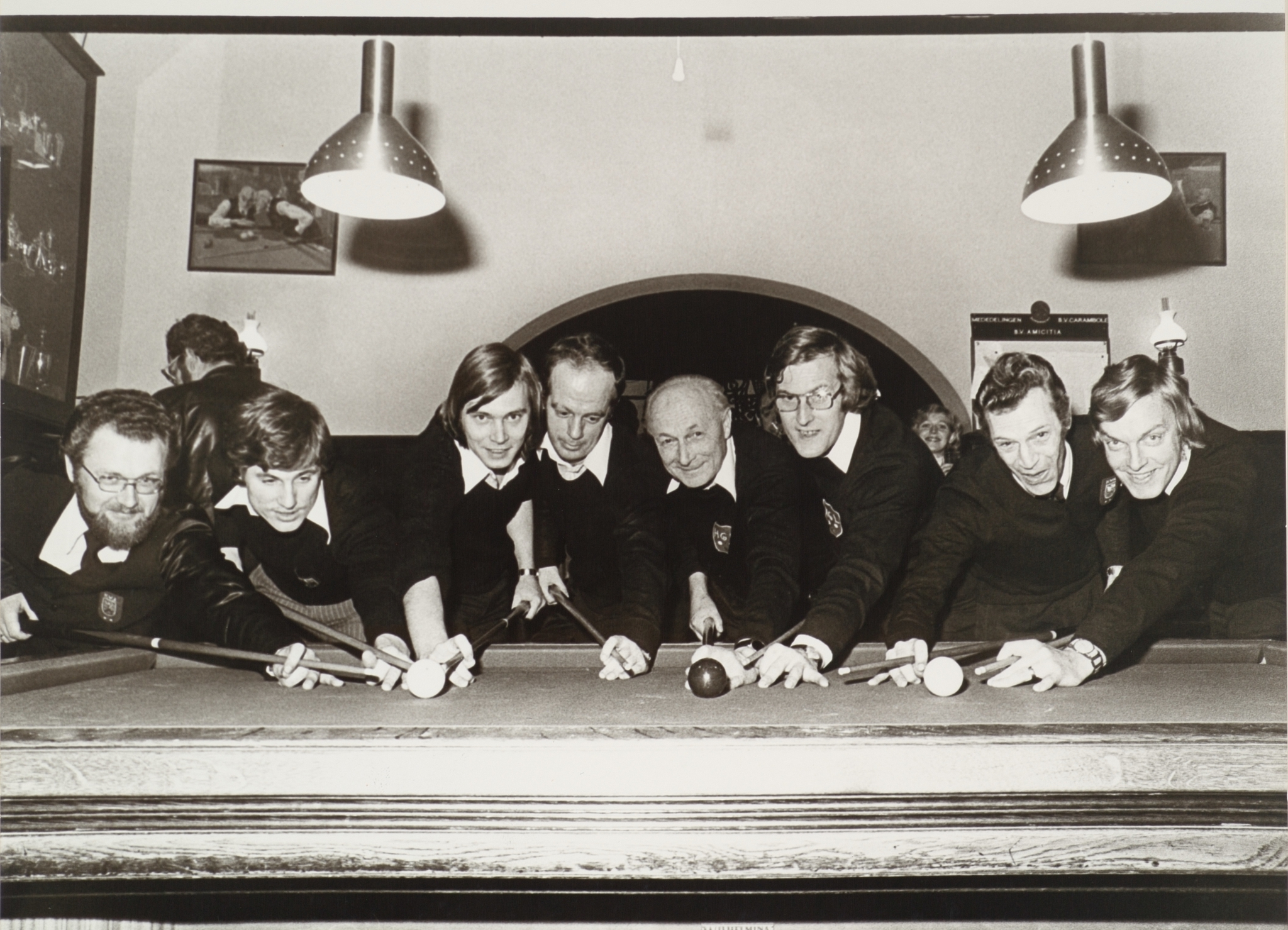 Leden van een Biljartvereniging Amicitia poseren boven het groene laken