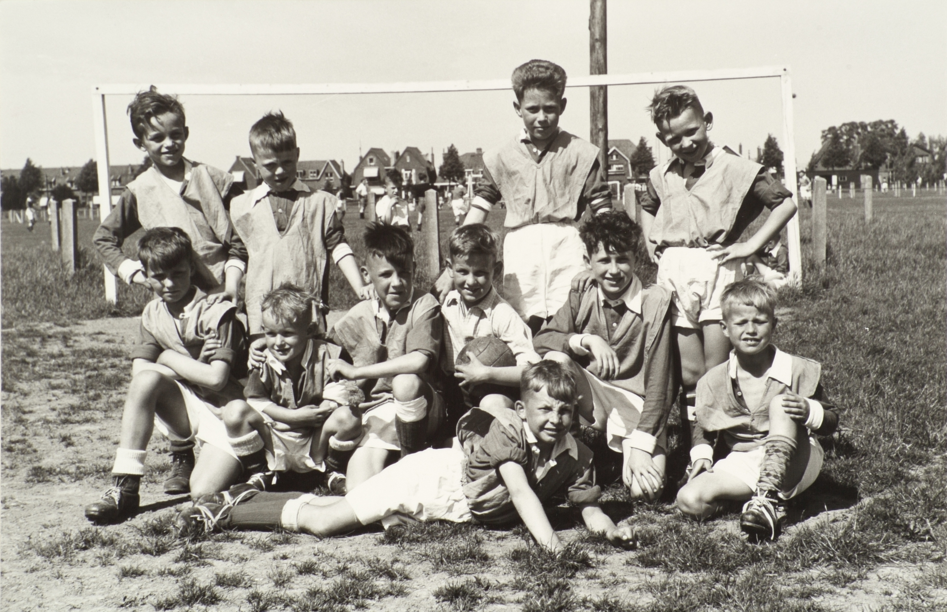 - Jeugdelftal van DFC (met hesjes) op het achterveld van het sportterrein aan Reeweg Oost.